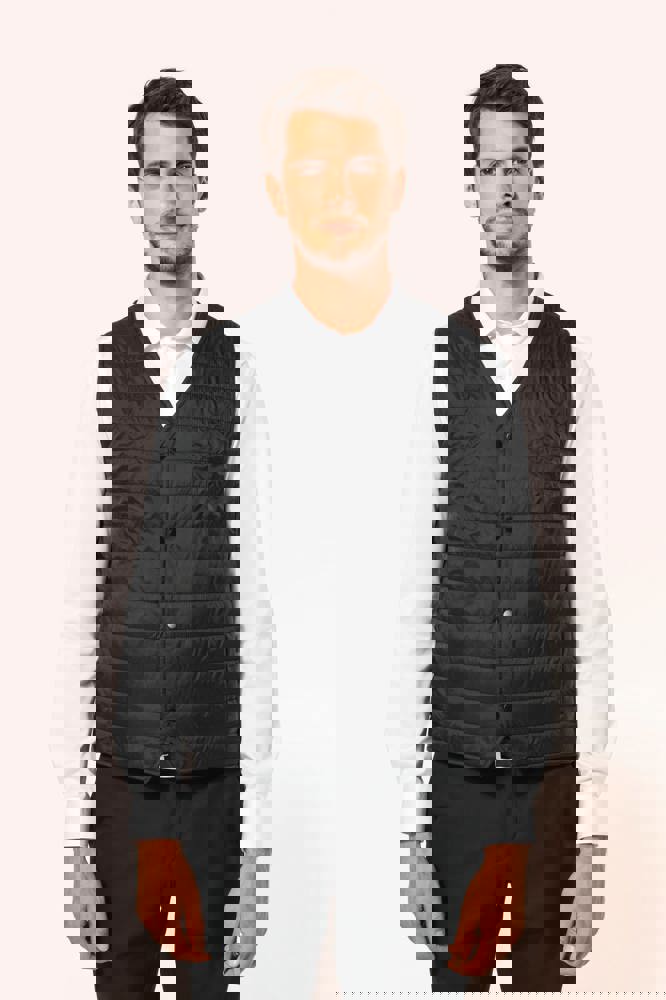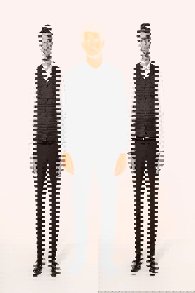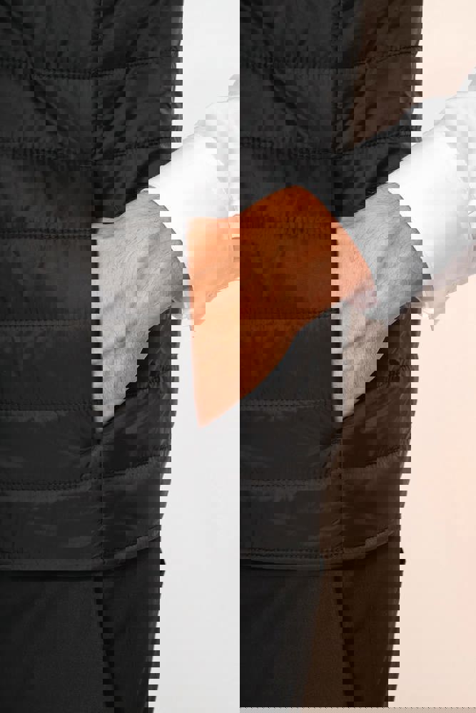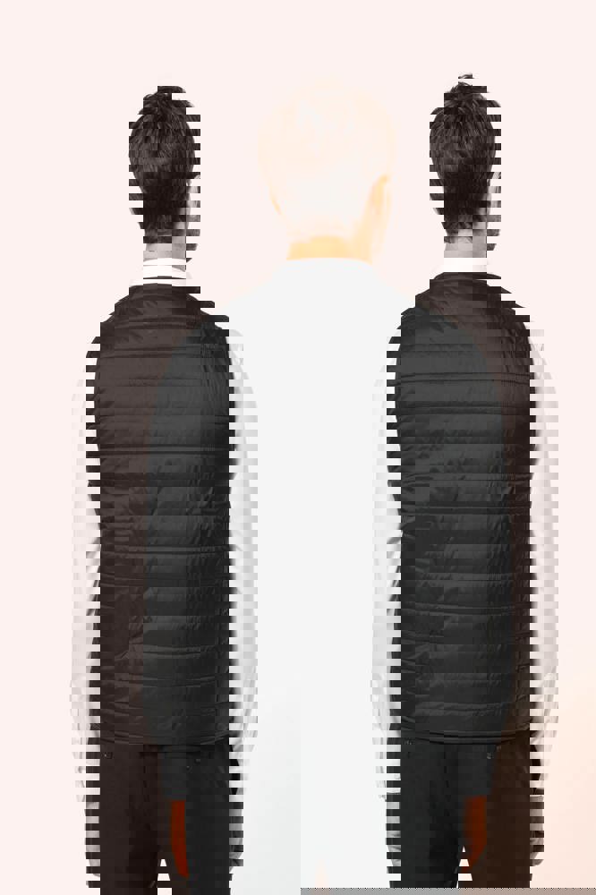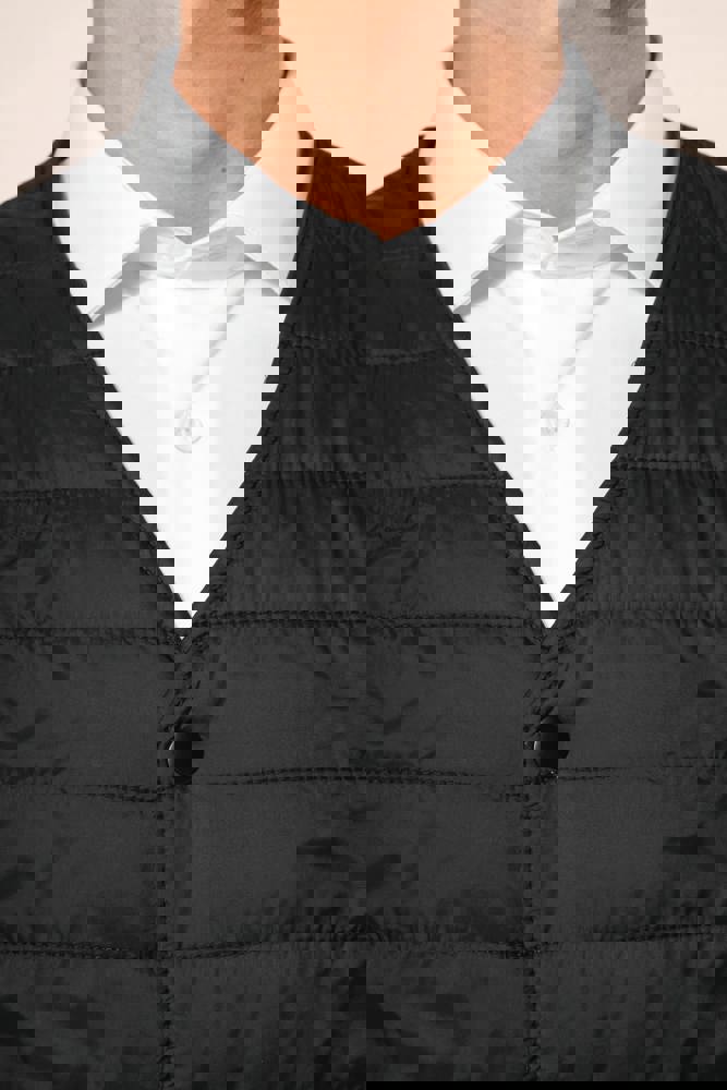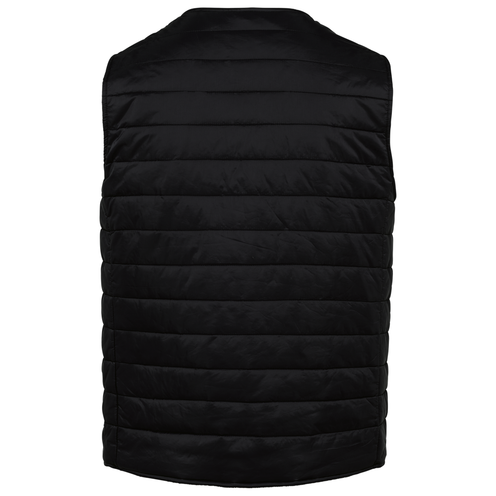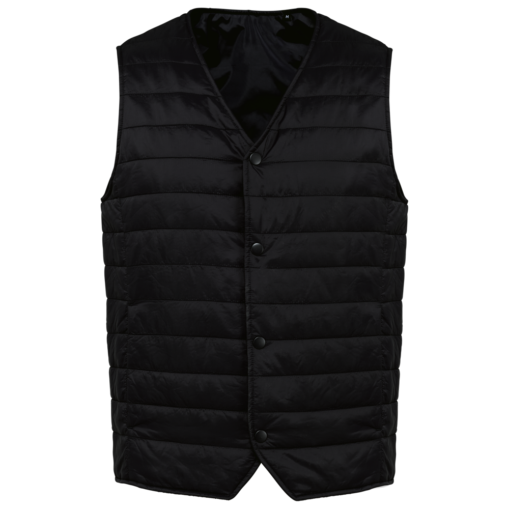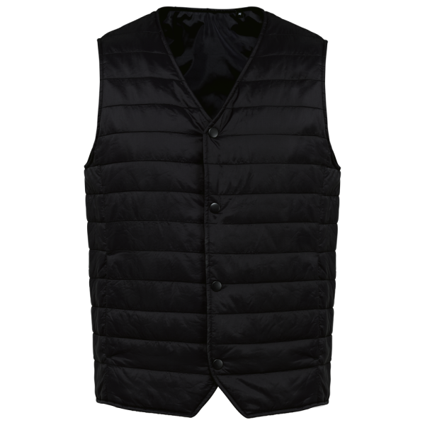 100% polyamide. Gevuld met Thinsulate®. Twee zijzakken. Sluit met ton-sur-ton drukknopen. Drukkersrits aan de linkerkant. Heel dun om onder een jasje te kunnen dragen. Geen merklabel, maar enkel een maatlabel voor eenvoudige personalisatie.