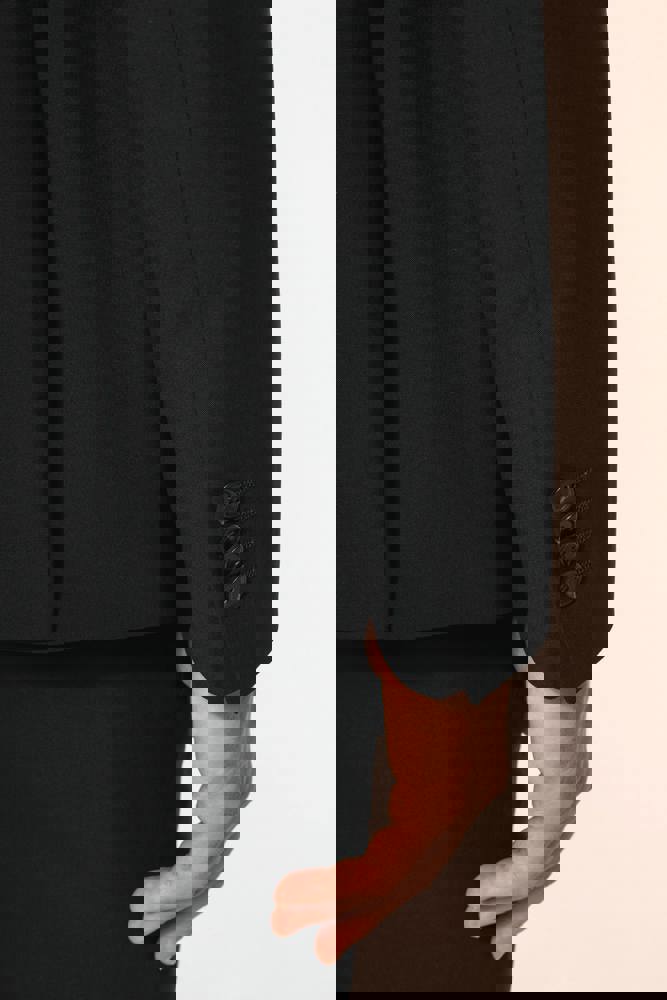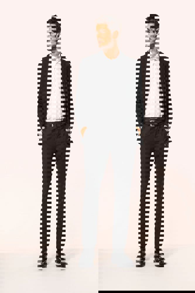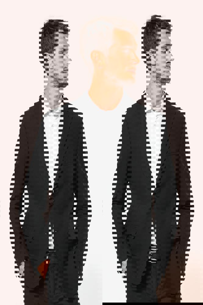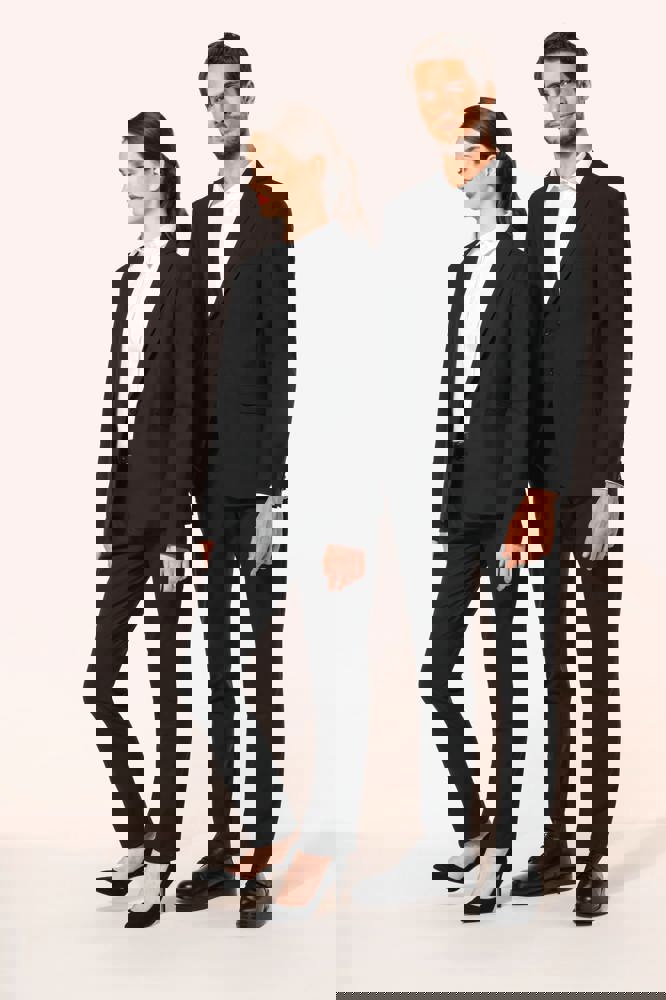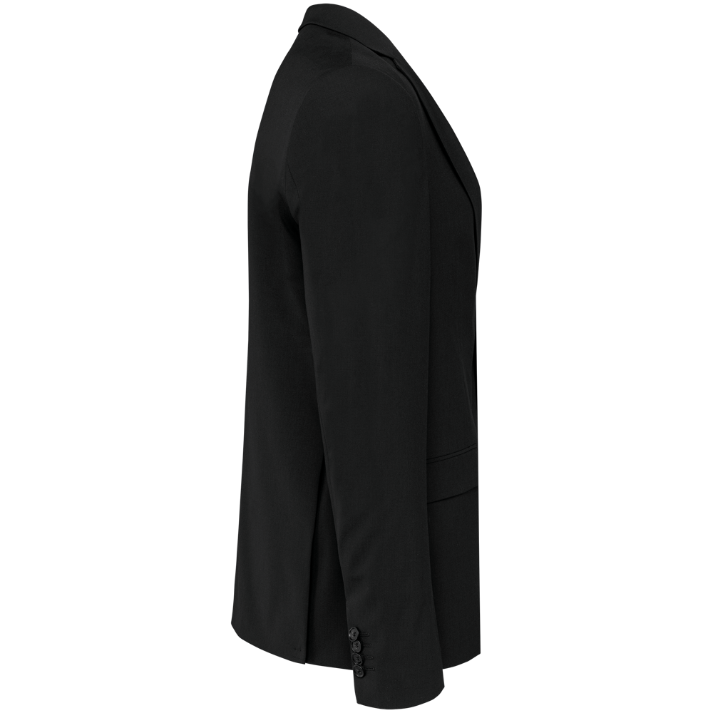 50% polyester / 23% viscose / 22% wol / 5% elasthan. Toon-op-toon voering in twill (100% polyester). Rechte snit. Jasje met twee ton-sur-ton knopen. Twee zakken met biesjes en kleppen, en een borstzakje met bies op de hartzijde. Vals toon-op-toon knoopsgat op de revers. Inzetsel opzij om het product vorm te geven. Satijnen ophanglus in de halsopening. Naad midden op de rug, Twee splitten onderaan. Mouwuiteinden met valse split en 4 toon-op-toon knopen. De twee borstzakjes binnenin zijn afgewerkt met een contrasterende bies. Links aan de binnenkant (bij het dragen) zitten een telefoonzakje en een ticketzakje met toon-op-toon bies. Drukkersrits aan de linkerkant (bij het dragen). Geen merklabel, maar enkel een maatlabel voor eenvoudige personalisatie.