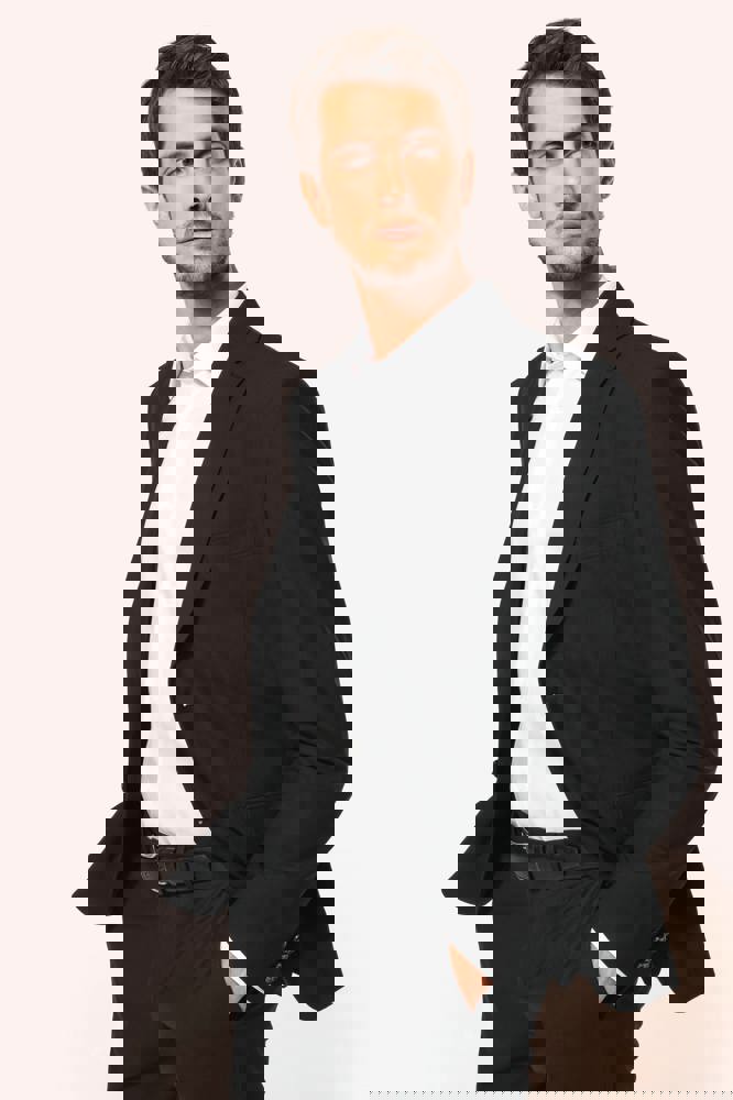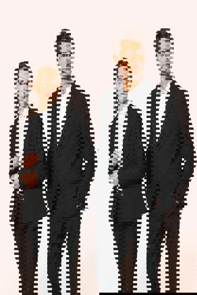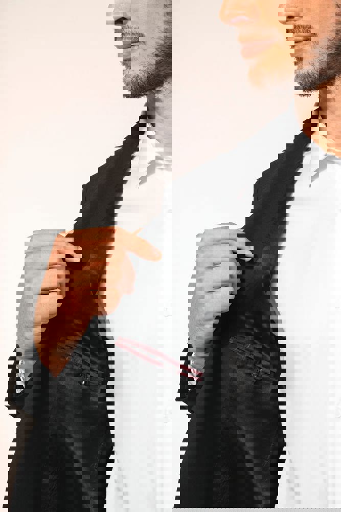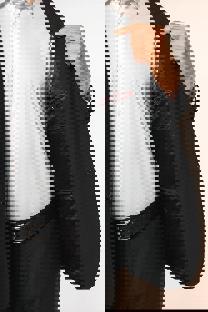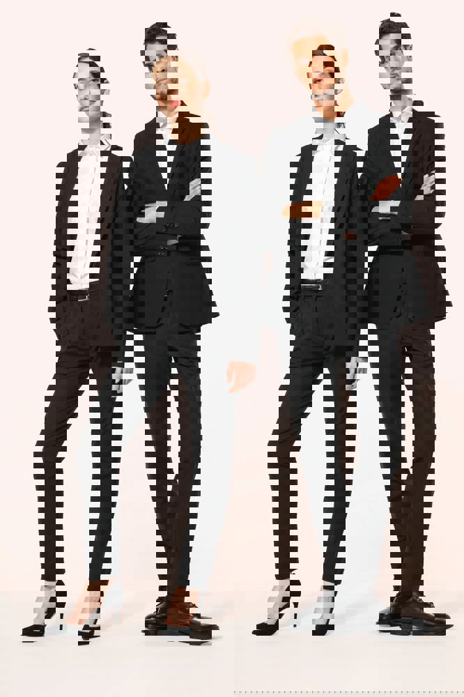 50% polyester / 23% viscose / 22% wol / 5% elasthan. Toon-op-toon voering in twill (100% polyester). Rechte snit. Jasje met twee ton-sur-ton knopen. Twee zakken met biesjes en kleppen, en een borstzakje met bies op de hartzijde. Vals toon-op-toon knoopsgat op de revers. Inzetsel opzij om het product vorm te geven. Satijnen ophanglus in de halsopening. Naad midden op de rug, Twee splitten onderaan. Mouwuiteinden met valse split en 4 toon-op-toon knopen. De twee borstzakjes binnenin zijn afgewerkt met een contrasterende bies. Links aan de binnenkant (bij het dragen) zitten een telefoonzakje en een ticketzakje met toon-op-toon bies. Drukkersrits aan de linkerkant (bij het dragen). Geen merklabel, maar enkel een maatlabel voor eenvoudige personalisatie.