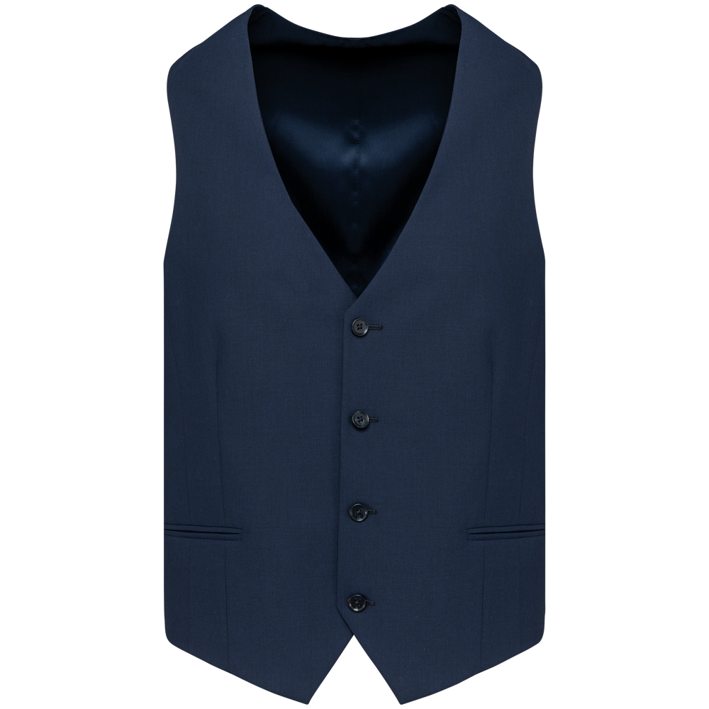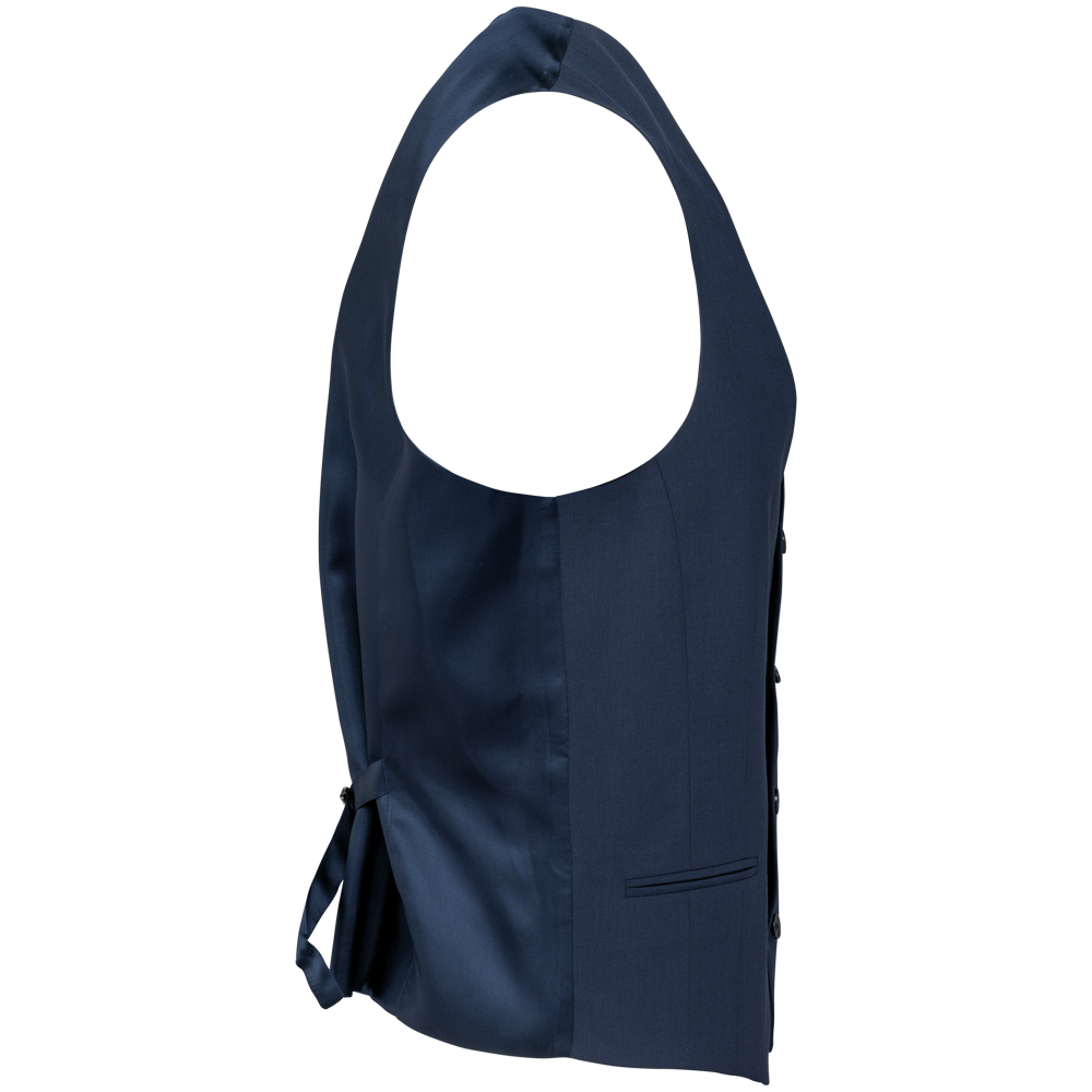 50% polyester / 23% viscose / 22% wol / 5% elasthan. Ander toon-op-toon materiaal in twill (100% polyester) op de buitenkant van de rug en binnenin. Rechte snit. Het gilet sluit met vier toon-op-toon knopen (met een reserveknoop) vanaf maat 58. Twee zakken met bies aan de voorkant. Verstelbare lijst met metalen gesp op de achterkant. Naad midden op de rug, afgewerkt met een V-vormige split onderaan. Geen merklabel, maar enkel een maatlabel voor eenvoudige personalisatie.