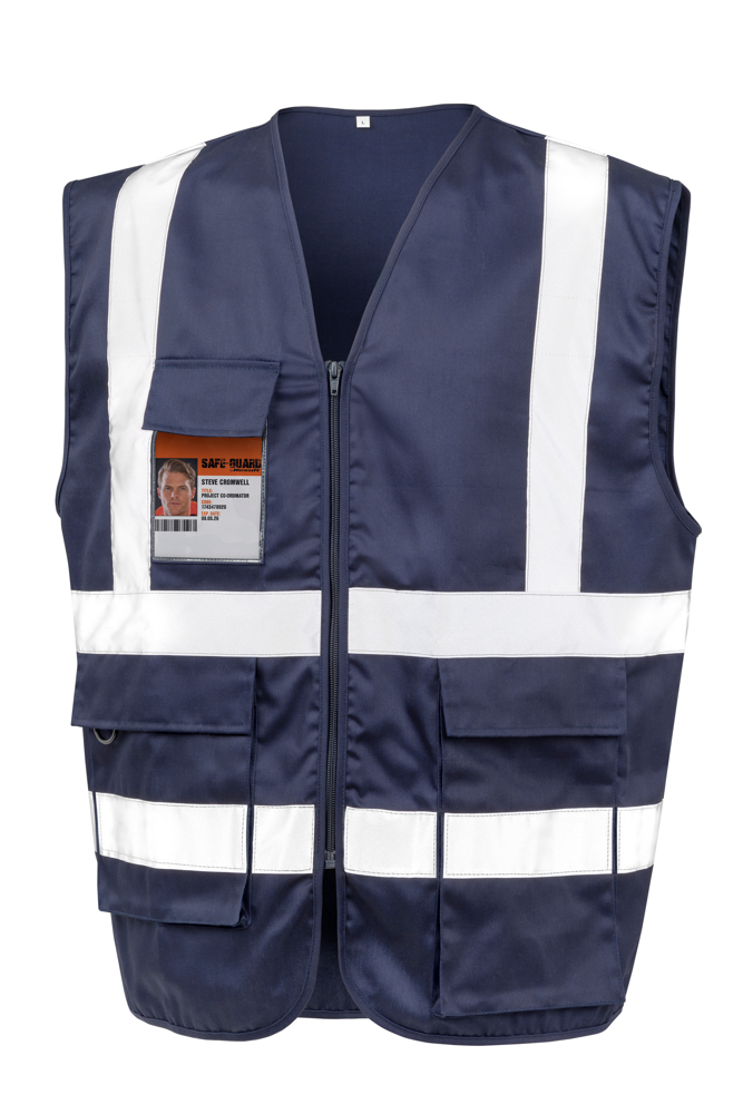 Veiligheidshesje met reflecterende stroken van 50 mm op het lichaam en de schouders. Zijzakken met verschillende dieptes en met klittenbandsluiting. Boord in dezelfde kleur. Borstzak met zakje voor toegangsbadge. Ritssluiting aan de voorkant. EN ISO 13688:2013. Fluorescent Yellow en Fluorescent Orange : EN ISO 2013+A1 :2016 Class 2. Black en Navy : EN17353:2020 (Type B3 alleen voor nachtgebruik).