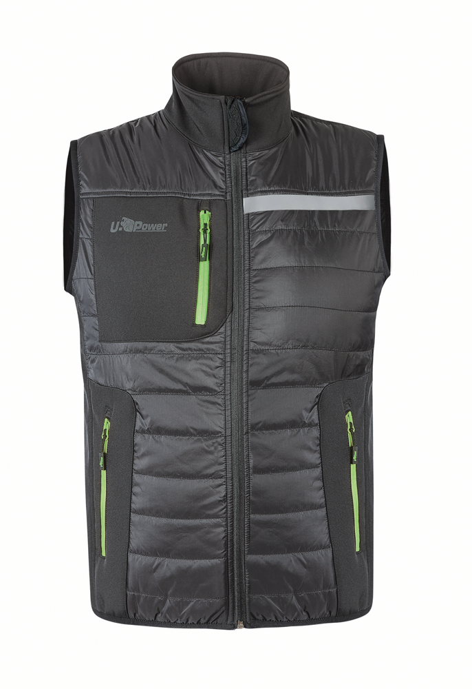 Gewatteerd mouwloos werkjack van grafeen met thermoregulerende eigenschappen die warmte afvoeren wanneer dat nodig is en het lichaam in een ideaal microklimaat houden bij lage temperaturen. Waterdicht mouwloos jack met bacteriostatische eigenschappen die nare geurtjes tegengaan en zorgen voor een betere kledinghygiëne. Mouwloos jack met meerdere zakken, twee voorzakken met rits, een verticale borstzak met rits en een binnenzak met klittenbandsluiting. Onderkant en armsgaten van elastische stof, zijstukken van zachte elastische softshell voor optimale pasvorm en comfort. Wall is een mouwloos jack met reflecterende U-Power logo-opdruk op de rechterborst en U-Supremacy opdruk op de rug.