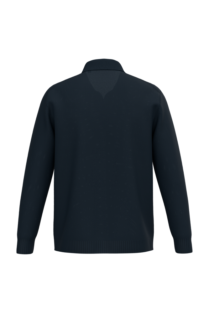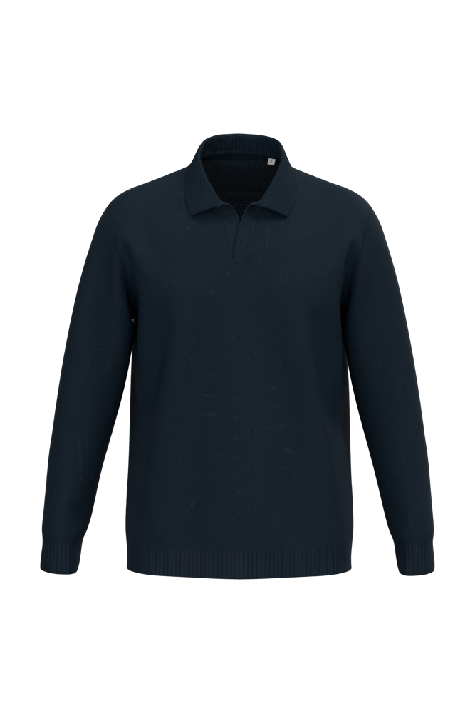 100% katoen. Gekamd katoen. Tricot. Gauge 7. Rechte snit. Kraag en V-hals zonder knoopje in polostijl. 1x1 ribboord in de kraag. 2x2 ribboord aan de zoom en de mouwuiteinden. Breiwerk in 'Fully Fashion'. Gemiddeld gewicht in maat L: 460 g.
