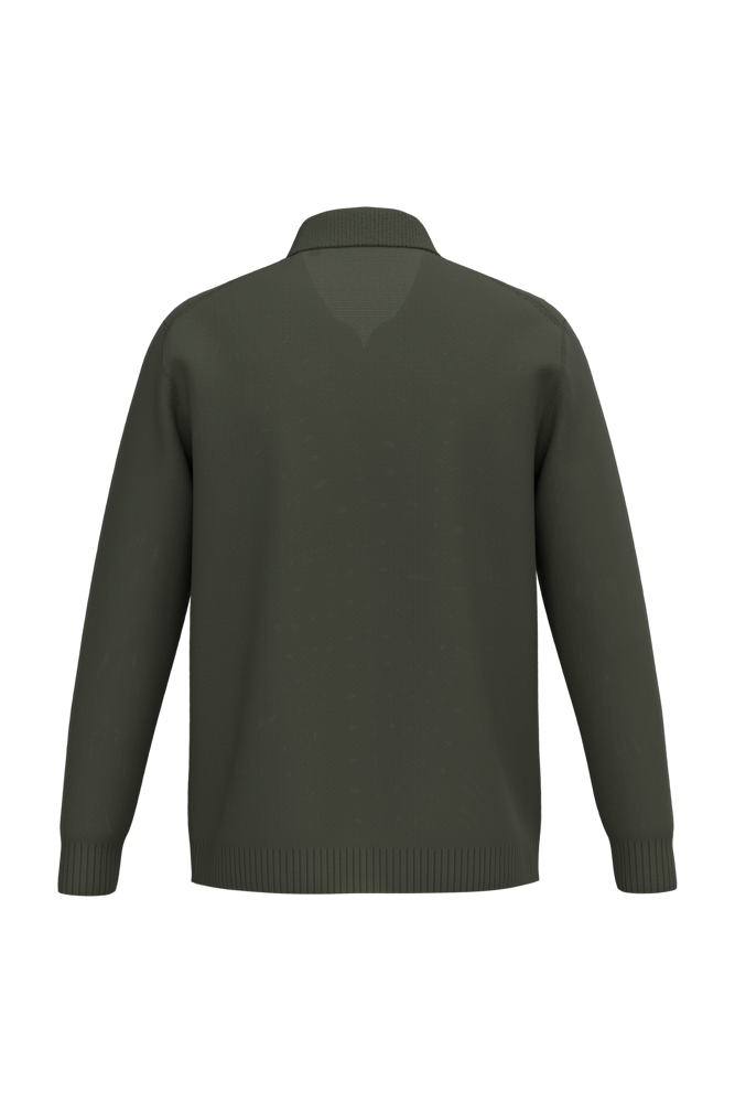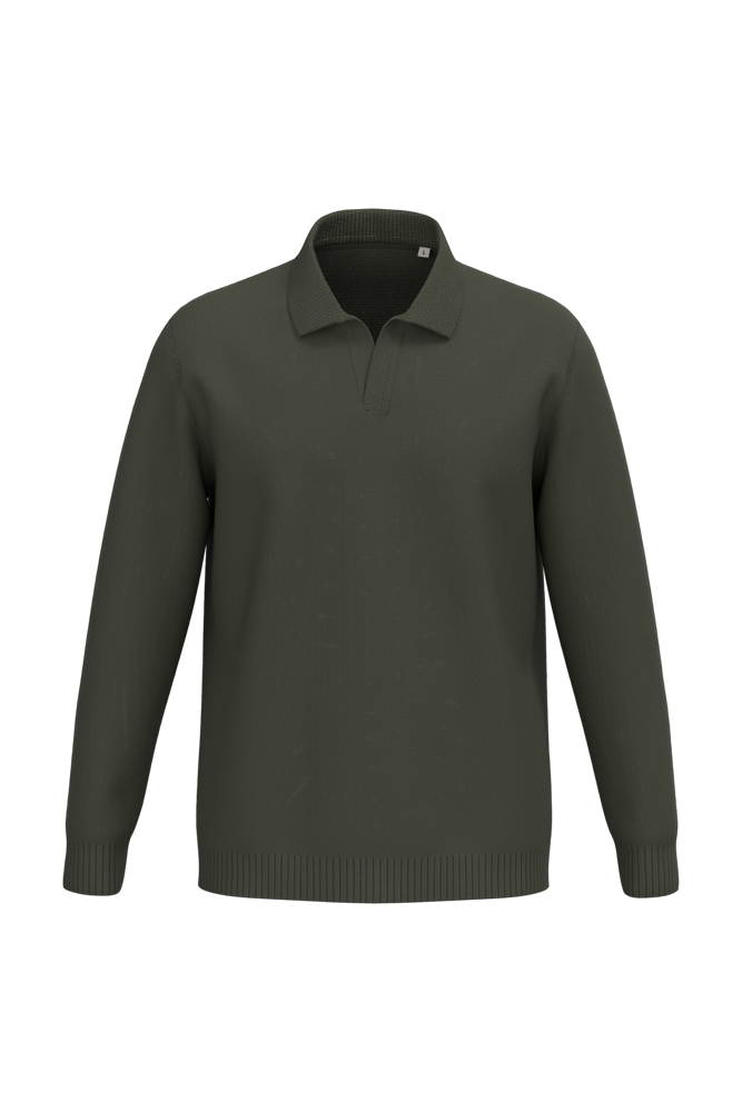 100% katoen. Gekamd katoen. Tricot. Gauge 7. Rechte snit. Kraag en V-hals zonder knoopje in polostijl. 1x1 ribboord in de kraag. 2x2 ribboord aan de zoom en de mouwuiteinden. Breiwerk in 'Fully Fashion'. Gemiddeld gewicht in maat L: 460 g.