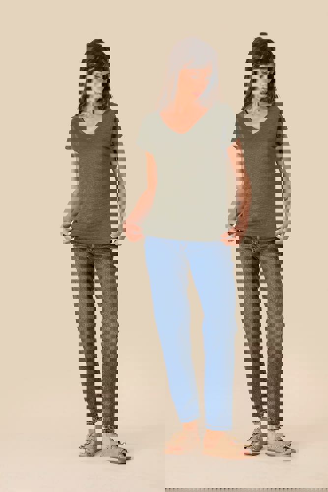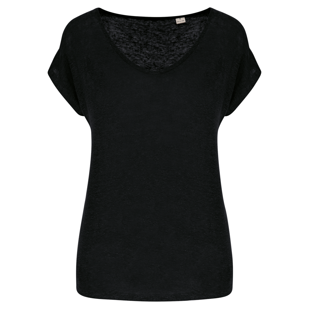 100 % Linnen. Tricot. Rechte snit. Zijnaden. Hals in de hoofdstof. Nektape in de hoofdstof in de kraag. Zoom met dubbel stiksel aan de mouwuiteinden en onderkant.