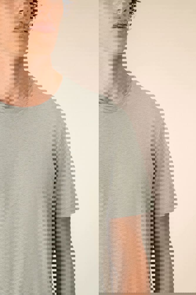 70 % Biologisch Katoen / 30 % Linnen. Tricot. Gekamd en ringgesponnen katoen. Rechte snit. Zijnaden. Enzymgewassen. 1 x 1 ribboord. Nektape in de hoofdstof in de kraag. Zoom met enkel stiksel aan de mouwuiteinden en onderkant.
