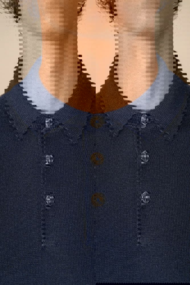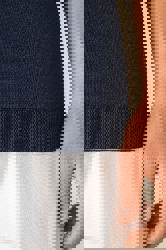 100% biokatoen. Gekamd katoen. Gauge 12. Rechte snit. Knooplijst met 3 knopen. Contrasterende hoornlook knopen van gerecycled plastic. 1x1 ribboord aan hals en onderkant kledingstuk. Nektape in de hoofdstof. Breiwerk in 'Fully Fashion'. Gemiddeld gewicht in maat L: 225 g.