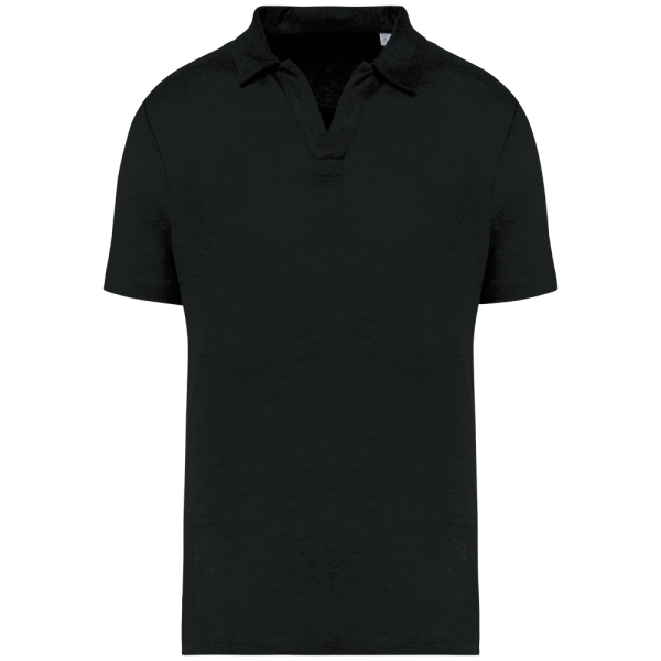 100 % linnen. Tricot. Rechte snit. Polokraag met staander en V-hals. met knooplijst zonder knoop in de hoofdstof. Dubbel stiksel aan de mouwboorden en de zoom. Zijsplitten met aan de binnenkant nektape in de hoofdstof. Halvemaan op de achterkant.