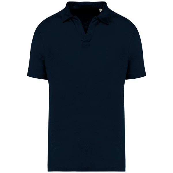 100 % linnen. Tricot. Rechte snit. Polokraag met staander en V-hals. met knooplijst zonder knoop in de hoofdstof. Dubbel stiksel aan de mouwboorden en de zoom. Zijsplitten met aan de binnenkant nektape in de hoofdstof. Halvemaan op de achterkant.