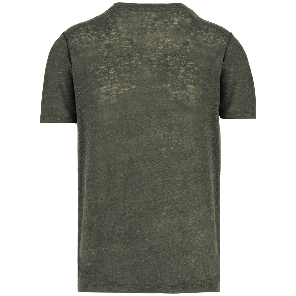 100 % Linnen. Tricot. Rechte snit. Zijnaden. Hals in de hoofdstof. Nektape in de hoofdstof in de kraag. Zoom met dubbel stiksel aan de mouwuiteinden en onderkant.