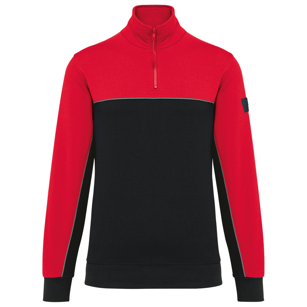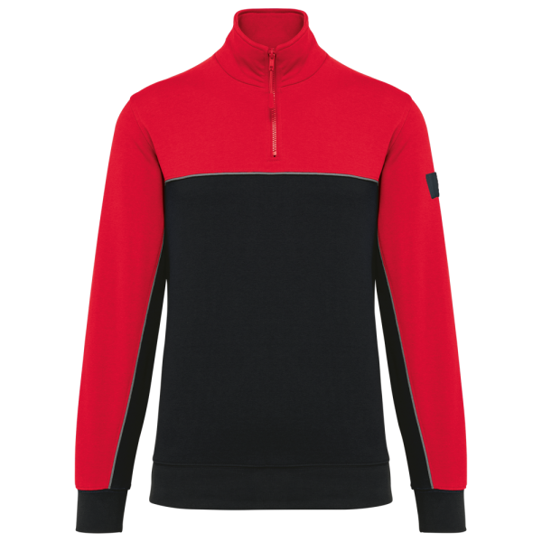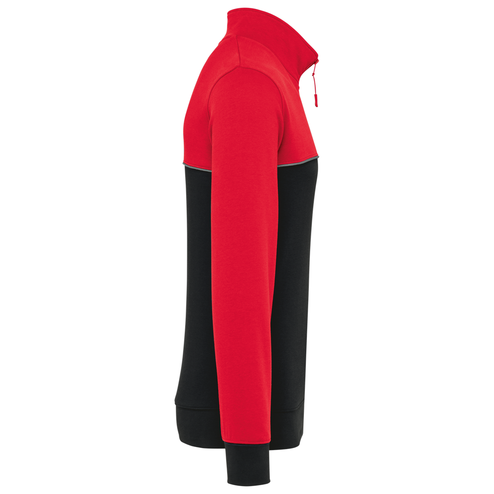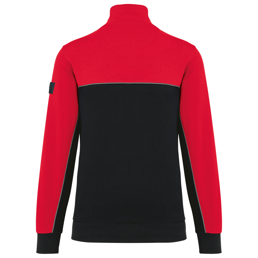 60% katoen / 40% gerecycleerd polyester. Aan de binnenkant geborsteld fleece 3 draden LSF (Low Shrinkage Fleece). Rechte snit. Ingezette mouwen. Kraag met plastic rits en gerecycleerde toon-op-toon ritstrekker. Contrasterende nektape met visgraatmotief. Halvemaanvormige halsopening op de achterkant, voor eenvoudige personalisatie van het merk aan de binnenkant. Contrasterende bies tussen de tweekleurige delen van het kledingstuk (lichaam, voorkant mouwen en rug). 1x1 ribboord aan mouwuiteinden en boord. Elastische penhouder met 3 vakken op de linkermouw. Tear-away merklabel.