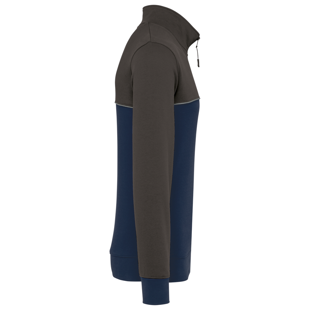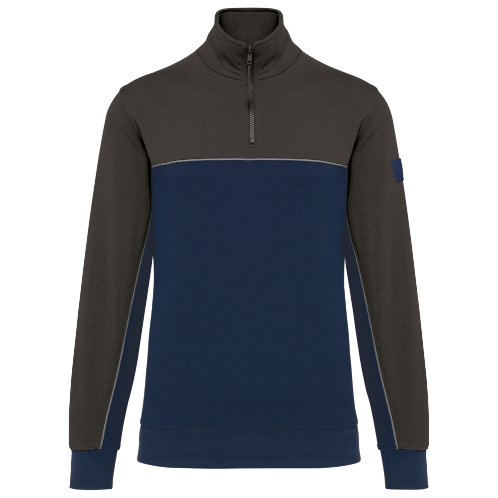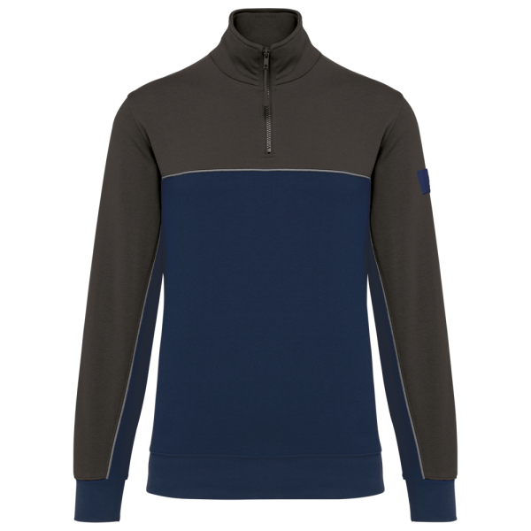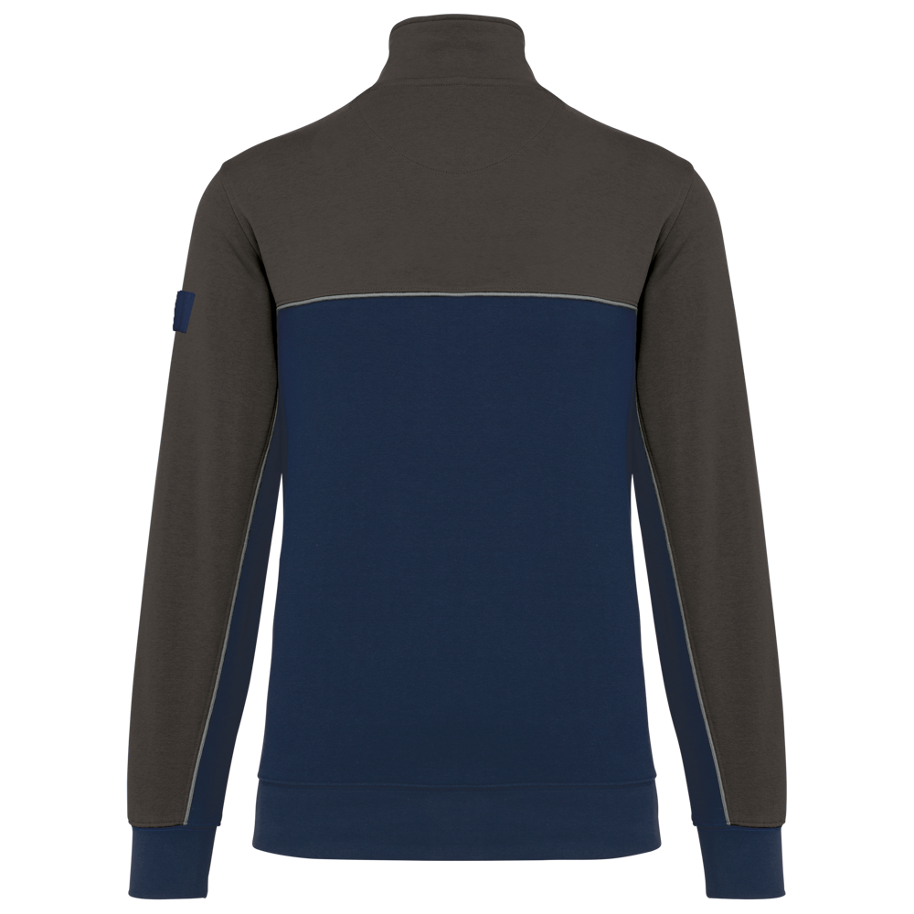 60% katoen / 40% gerecycleerd polyester. Aan de binnenkant geborsteld fleece 3 draden LSF (Low Shrinkage Fleece). Rechte snit. Ingezette mouwen. Kraag met plastic rits en gerecycleerde toon-op-toon ritstrekker. Contrasterende nektape met visgraatmotief. Halvemaanvormige halsopening op de achterkant, voor eenvoudige personalisatie van het merk aan de binnenkant. Contrasterende bies tussen de tweekleurige delen van het kledingstuk (lichaam, voorkant mouwen en rug). 1x1 ribboord aan mouwuiteinden en boord. Elastische penhouder met 3 vakken op de linkermouw. Tear-away merklabel.