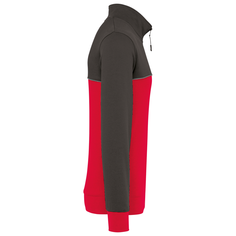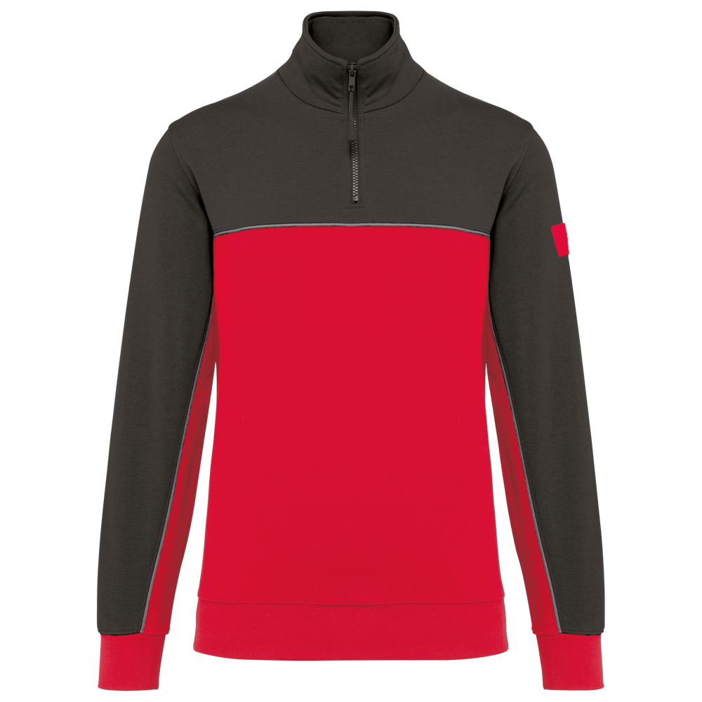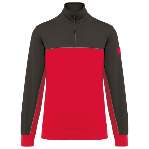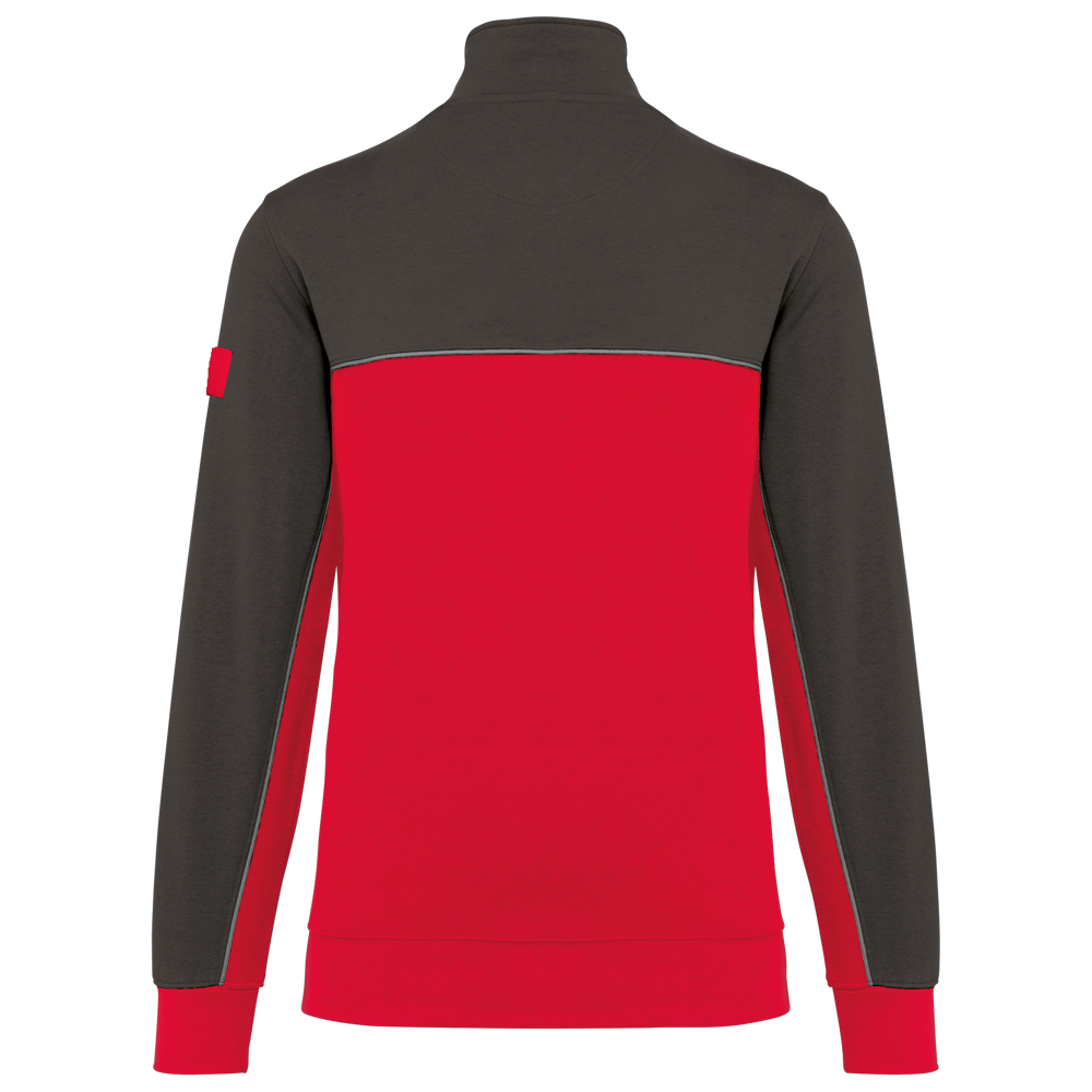 60% katoen / 40% gerecycleerd polyester. Aan de binnenkant geborsteld fleece 3 draden LSF (Low Shrinkage Fleece). Rechte snit. Ingezette mouwen. Kraag met plastic rits en gerecycleerde toon-op-toon ritstrekker. Contrasterende nektape met visgraatmotief. Halvemaanvormige halsopening op de achterkant, voor eenvoudige personalisatie van het merk aan de binnenkant. Contrasterende bies tussen de tweekleurige delen van het kledingstuk (lichaam, voorkant mouwen en rug). 1x1 ribboord aan mouwuiteinden en boord. Elastische penhouder met 3 vakken op de linkermouw. Tear-away merklabel.
