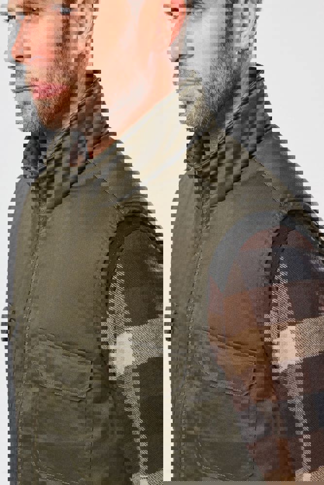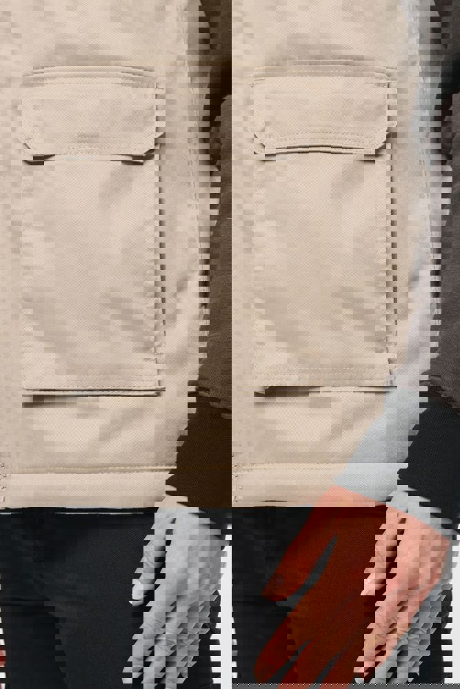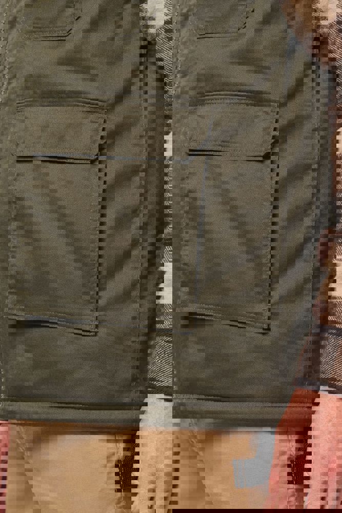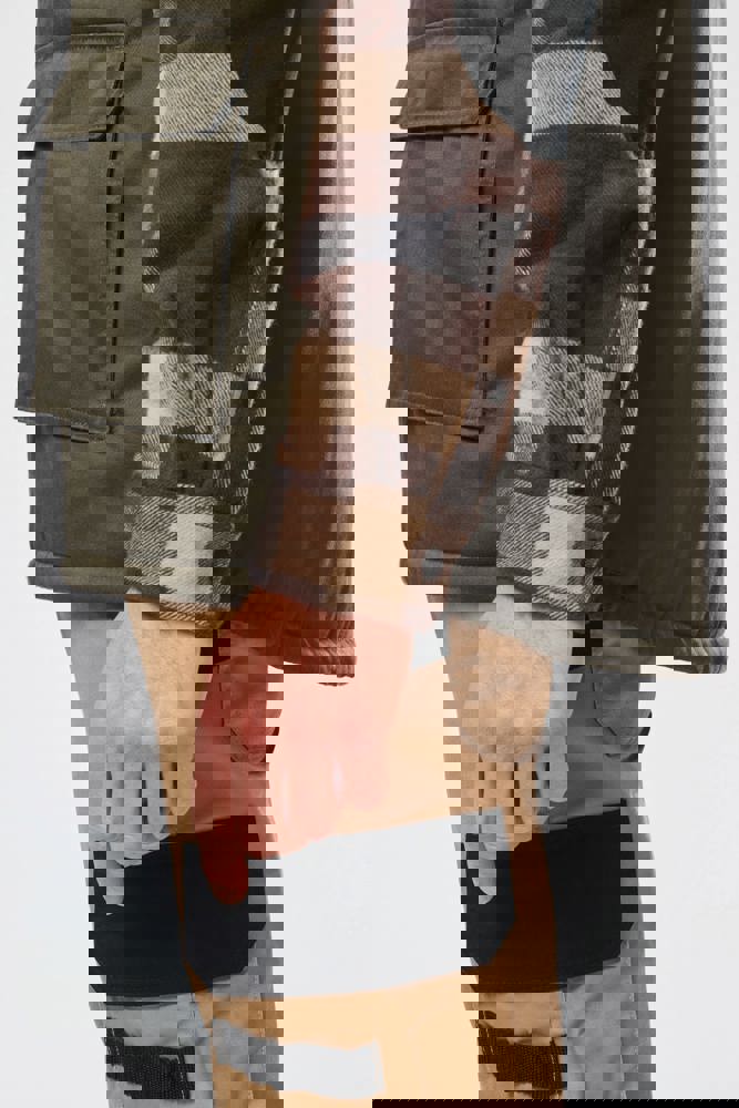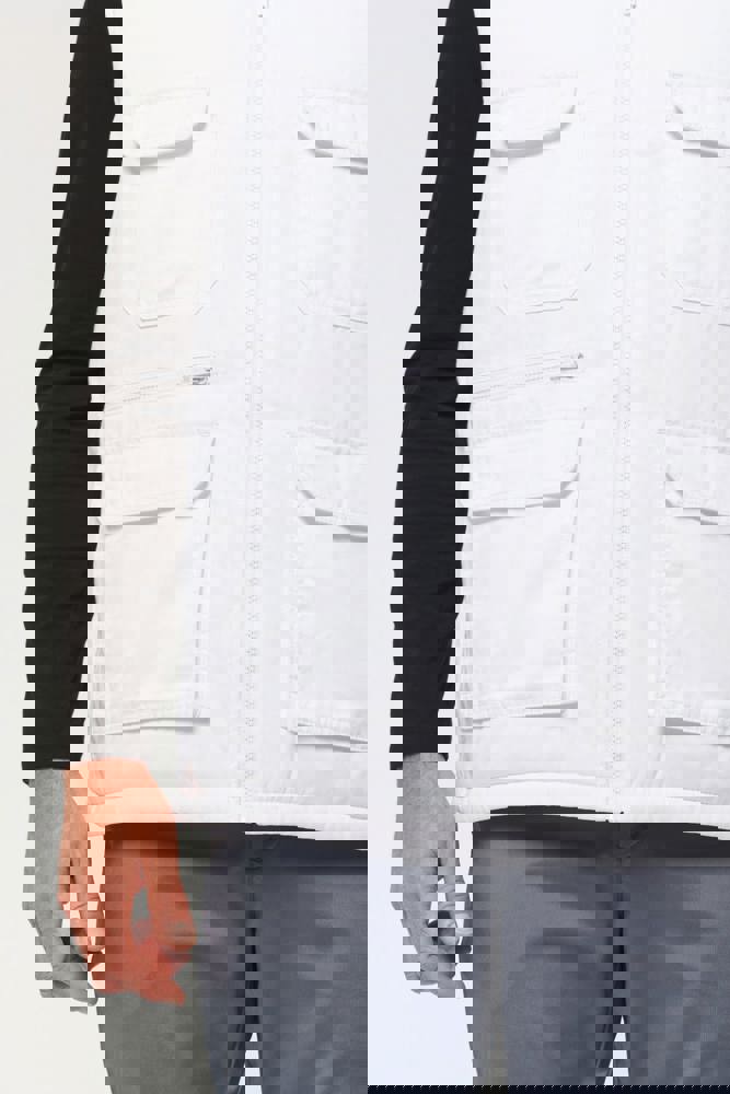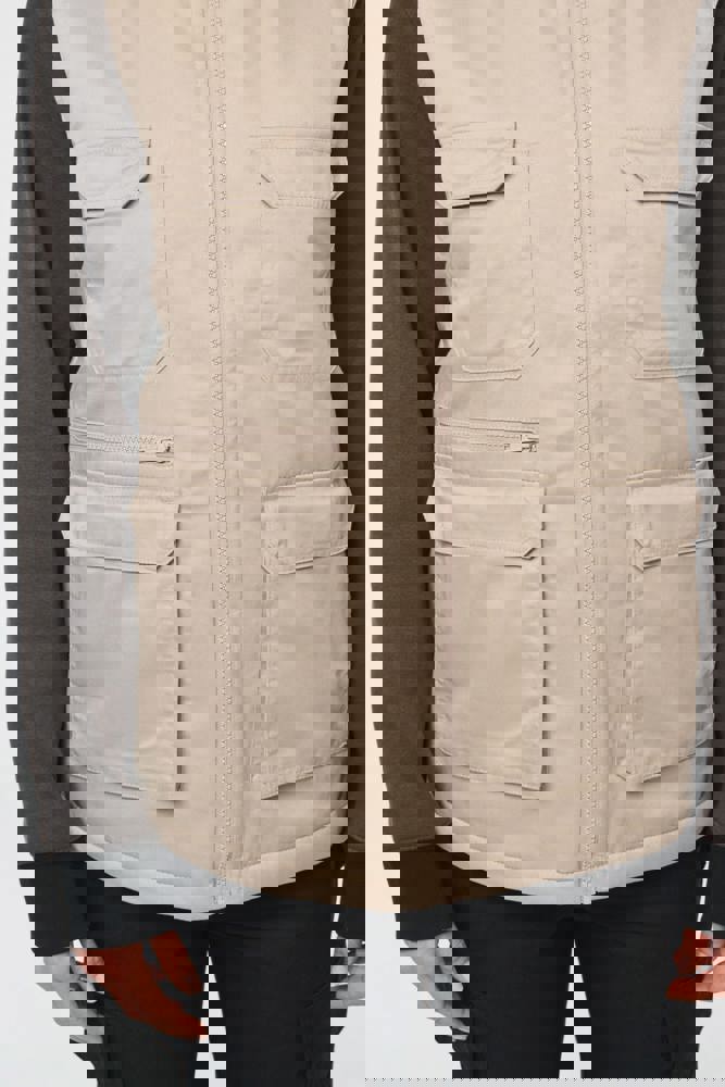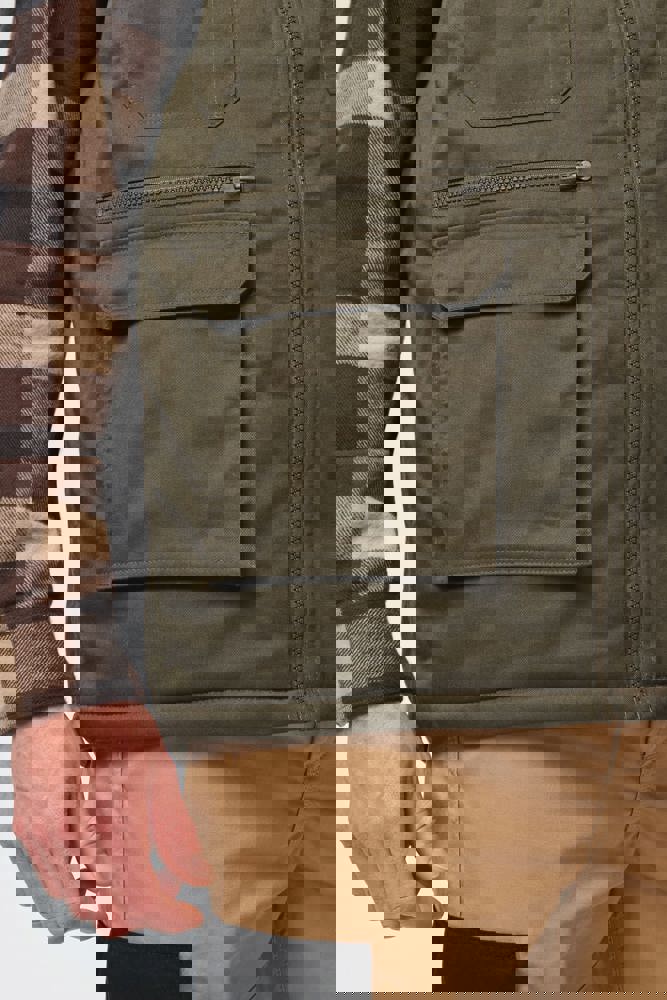 Buitenkant: 65% polyester / 35% katoen. Binnenvoering 100% polyester. Binnenvoering 100% polyester. Rechte snit. 2 grote opgezette zakken met klep en klittenbandsluiting en zijopening + 2 opgezette borstzakjes met klep en klittenbandsluiting, waarvan 1 met een open pennenvakje. 1 zak met ton-sur-ton plastic rits op de voorkant rechts. 1 binnenzak met klittenbandsluiting op de borst links. Ton-sur-ton plastic ritssluiting. Ophanglus in de kraag. Verlengd achterpand. Verborgen drukkersrits onderaan. Tear-away merklabel.