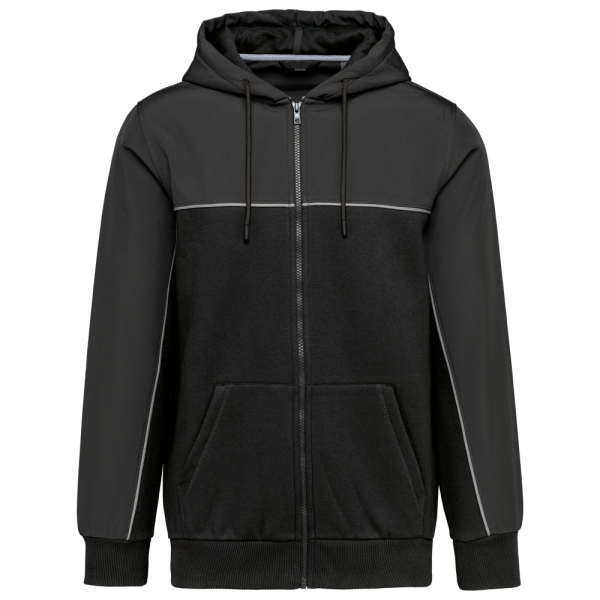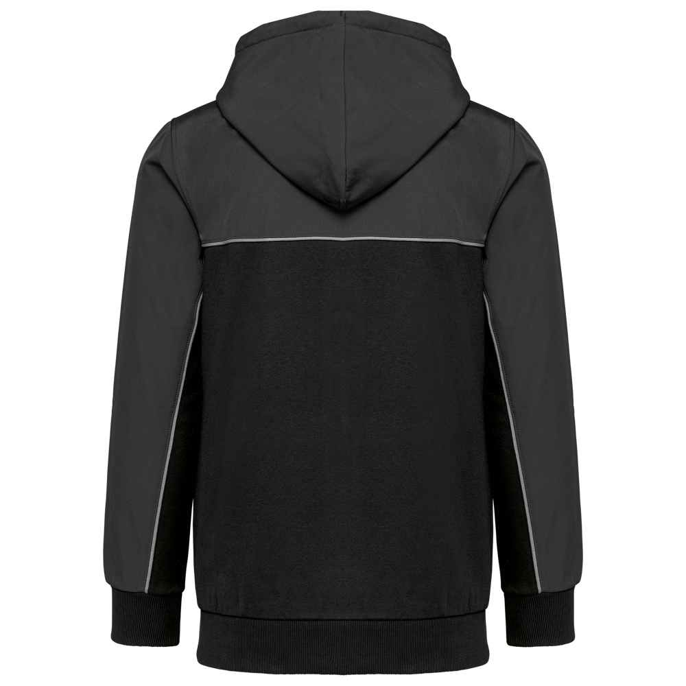 60% katoen / 40% gerecycleerd polyester. Stof van de inzetstukken: waterafstotende softshell 2 lagen 95% polyester / 5% elasthan. Rechte snit. 2 kangoeroezakken. Capuchon in 2 delen met rond aanrijgkoordje met rubberen uiteinden. Contrasterende inzetsels vooraan, achteraan en bovenaan de mouwen. Toon-op-toon ritssluiting aan de voorkant. Halvemaan in softshell op de rug. Contrasterende bies in Silver op de inzetsels vooraan en aan de mouwen. Ophanglus en nektape in kepermotief in Silver in de kraag. Mouwuiteinden en boord onderaan in 2x2 ribboord in buisconstructie. Afneembaar merklabel.