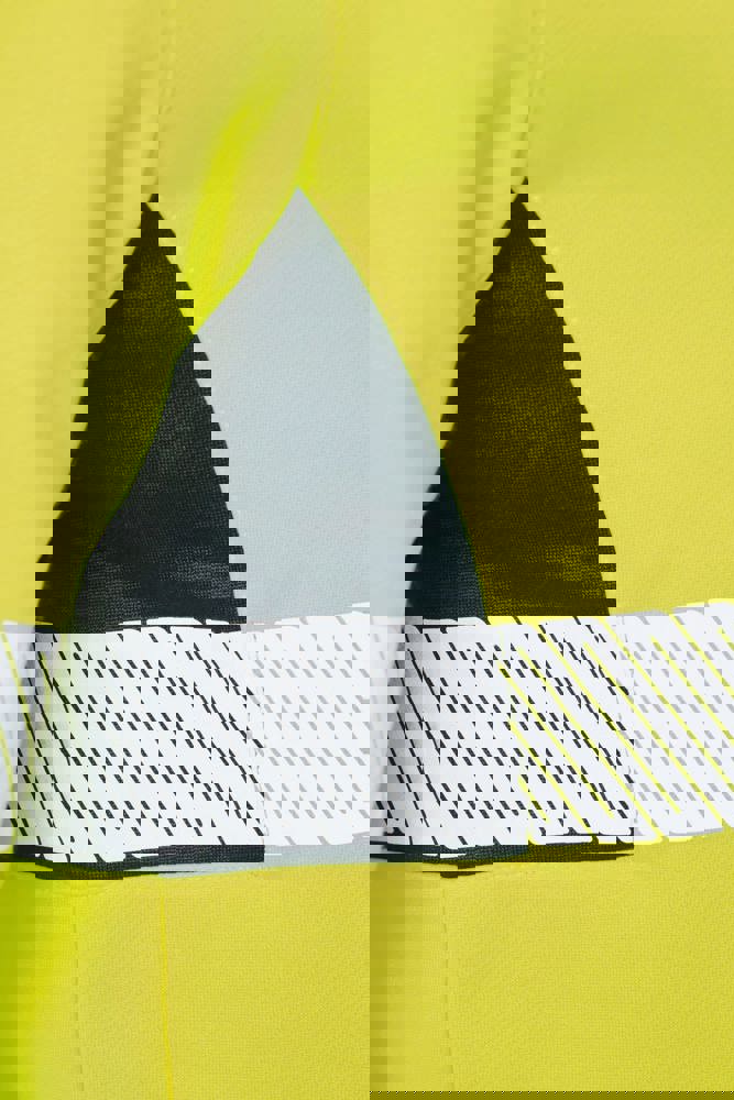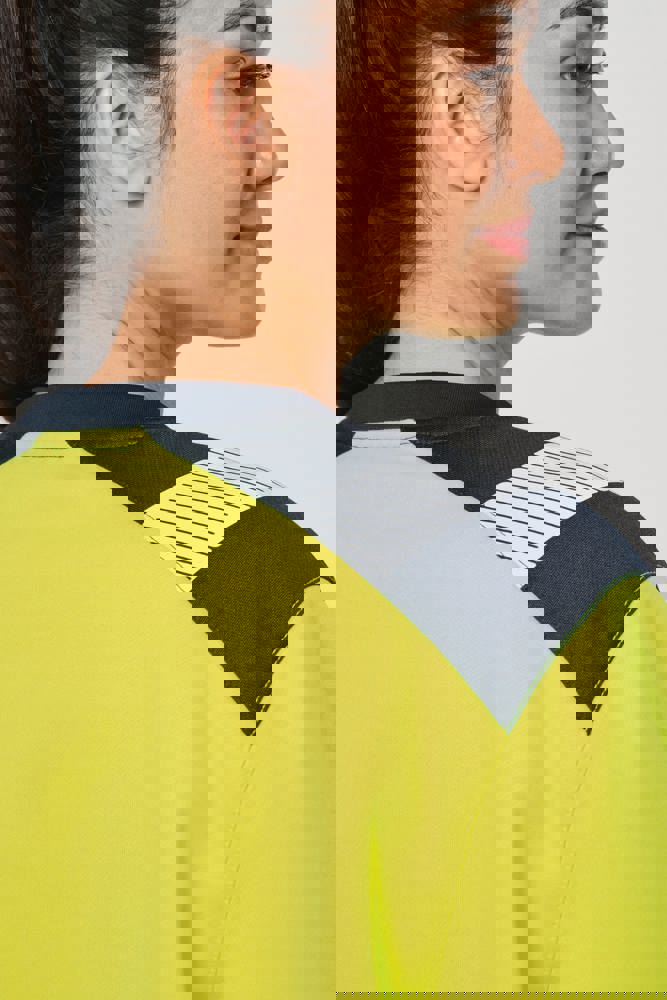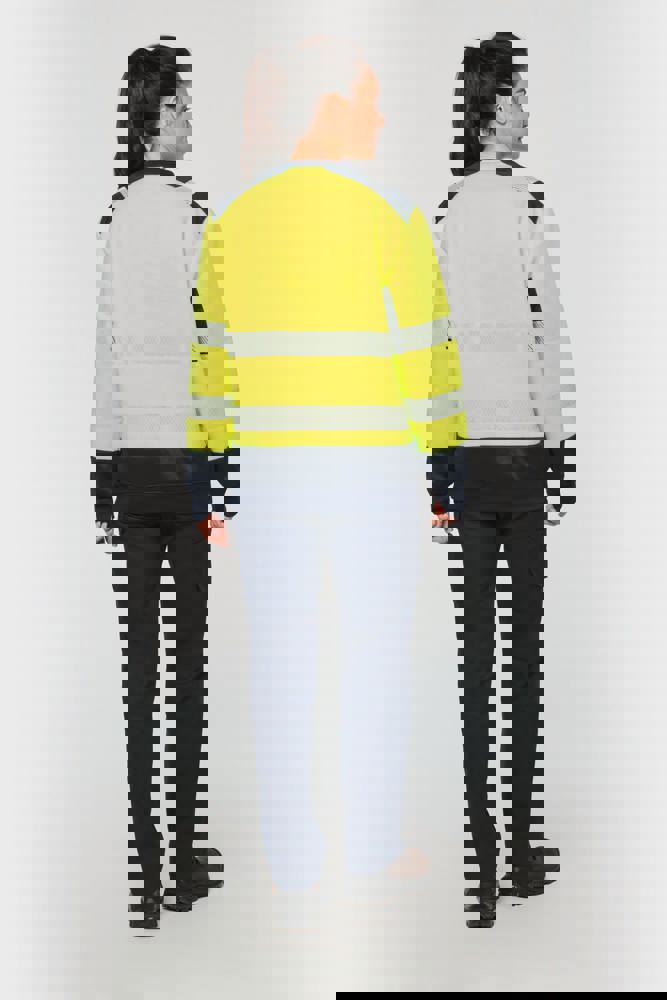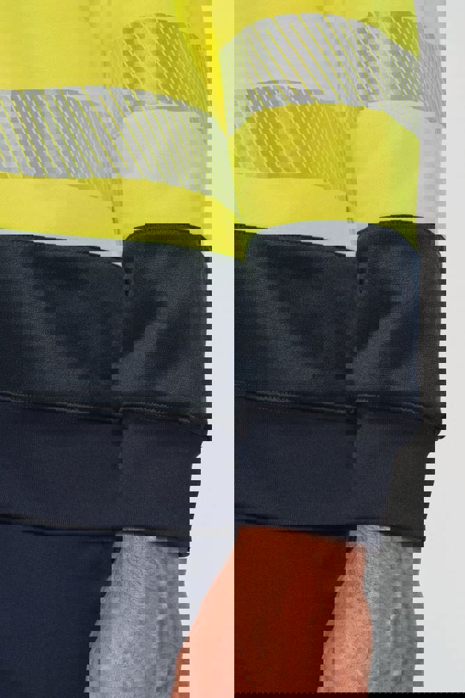 65% gerecycled polyester / 35% katoen. Gekamd katoen. Geborsteld fleece. Anti-pilling behandeling. Wasbaar op 60°C (25 wasbeurten). Regular fit. Contrasterende schouderinzetten met een 5 cm brede segmentreflecterende band. Kraag gevoerd met 100% gerecycled polyester in 1x1 ribboord. Contrasterend inzetstuk onder de armen. Twee segmentreflecterende banden van 5 cm aan de voor- en achterkant en op de mouwen. Contrasterende onderkant van de mouwen en het kledingstuk. 1x1 ribboord in contrasterend 100% gerecycled polyester aan de onderkant van de mouwen en het kledingstuk. PBM Klasse II. Normen NF EN 13758-1+A1:2007 + NF EN 13758-2+A1:2007: UPF40+ bescherming tegen UV-straling, NF EN ISO 13688:2013 + NF EN ISO 13688/A1:2021 (Algemene eisen voor beschermende kleding), NF EN ISO 20471:2013 + NF EN ISO 20471/A1:2017: Klasse 2 (Hoge zichtbaarheid kleding - testmethoden en eisen), RIS-3279-TOM Issue 2:2019 alleen voor de kleur Hi Viz Oranje/Marine (Spoorwegindustrie norm). Afneembaar merketiket.