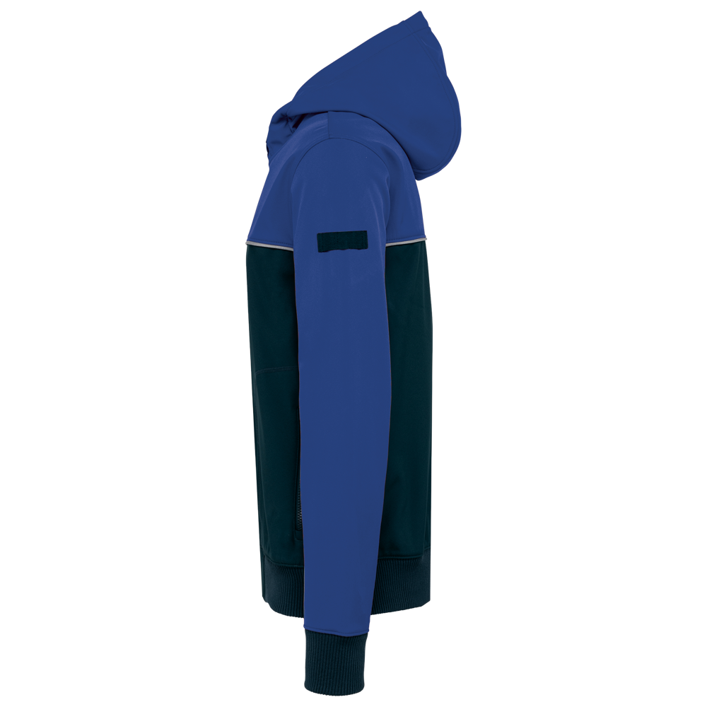 96% polyester / 4% elasthan. 3-laagse ademende stof 3000 g/m²/24 u en waterdicht 5000 mm. Buitenkant: 96% polyester / 4% elasthan. Tussenlaag: ademend en waterdicht membraan. Binnenlaag: microfleece. BIONIC FINISH ® ECO behandeling (waterdicht, zonder fluor voor optimale prestaties). Plastic ritssluiting met ton-sur-ton ritstrekker. 2 ritszakken met ritstrekker aan de voorkant. 3-delige, verstelbare capuchon met stoppers in de naad. Contrasterend nektape met ophanglint in de kraag. Elastische penhouder met 3 vakken op de linkermouw. Contrasterende bies tussen de tweekleurige delen van het kledingstuk (lichaam, voorkant mouwen en rug). Gevoerde 2x2 ribboord met elasthan aan de mouwuiteinden en de boord. Tear-away merklabel.