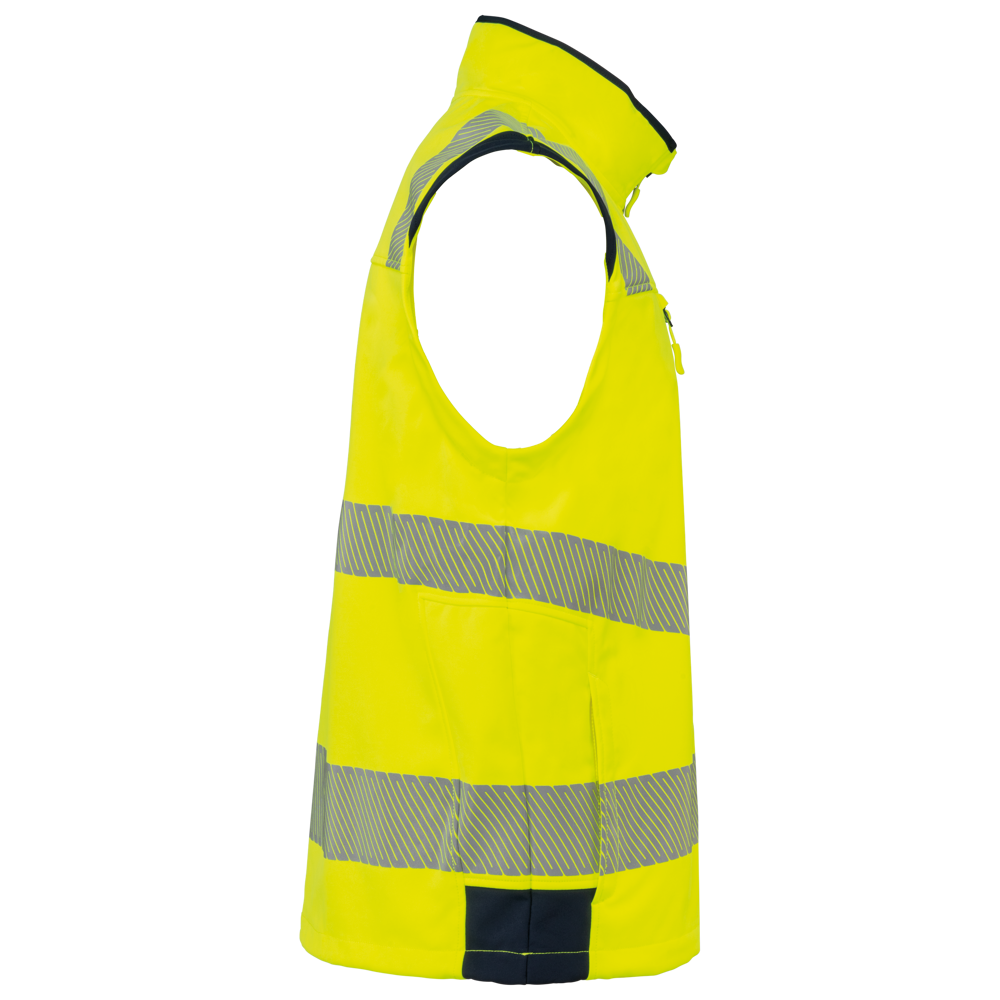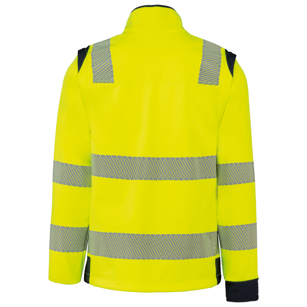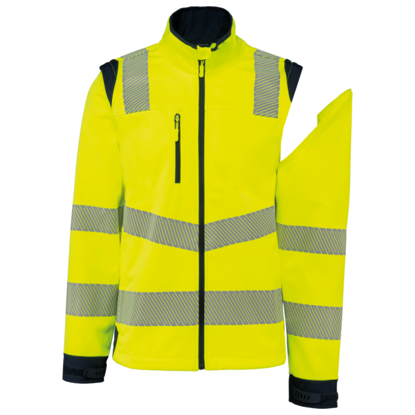 94% gerecycled polyester / 6% elastaan. 3-laags ademend gelamineerd materiaal met een waterdampdoorlaatbaarheid van 3000g/m²/24u en een waterdichtheid van 5000mm. Buitenkant: 94% gerecycled polyester / 6% elastaan. Tussenlaag: ademende en waterdichte membraan. Binnenlaag: 100% gerecycled polyester microfleece. Wasbaar op 40°C (25 wasbeurten). Nylon rits met kinbescherming en ritstrekkertje. 1 verticale borstzak met rits aan de rechterkant. 2 zijzakken met rits. 2 binnenzakken. Verstelbare manchetten met klittenband. Afneembare mouwen met rits. Onderaan verstelbaar met een trekkoord. Contrasterende inzetstukken op schouders, manchetten en zijkanten. Contrasterende binnenkant kraag en nekband. Ophanglus aan de binnenkant van de kraag. 5,5 cm gesegmenteerde reflecterende biezen op schouders, onder borst en mouwen. 7 cm retro-reflecterende gesegmenteerde banden op onderlichaam en mouwen. PBM Klasse II. Normen NF EN ISO 13688:2013 + NF EN ISO 13688/A1:2021 (Algemene eisen voor beschermende kleding), NF EN ISO 20471:2013 + NF EN ISO 20471/A1:2017: Kleding met mouwen: Klasse 2 voor maat XS en S - Klasse 3 voor maat M tot 6XL, Kleding zonder mouwen: Klasse 1 voor maat XS en S - Klasse 2 voor maat M tot 6XL (Hoogzichtbare kleding - Testmethoden en eisen), RIS-3279-TOM Issue 2:2019 alleen voor de kleur Hi Viz Orange/Navy (Norm voor de spoorwegindustrie). Afneembaar merketiket.