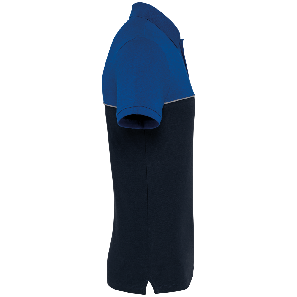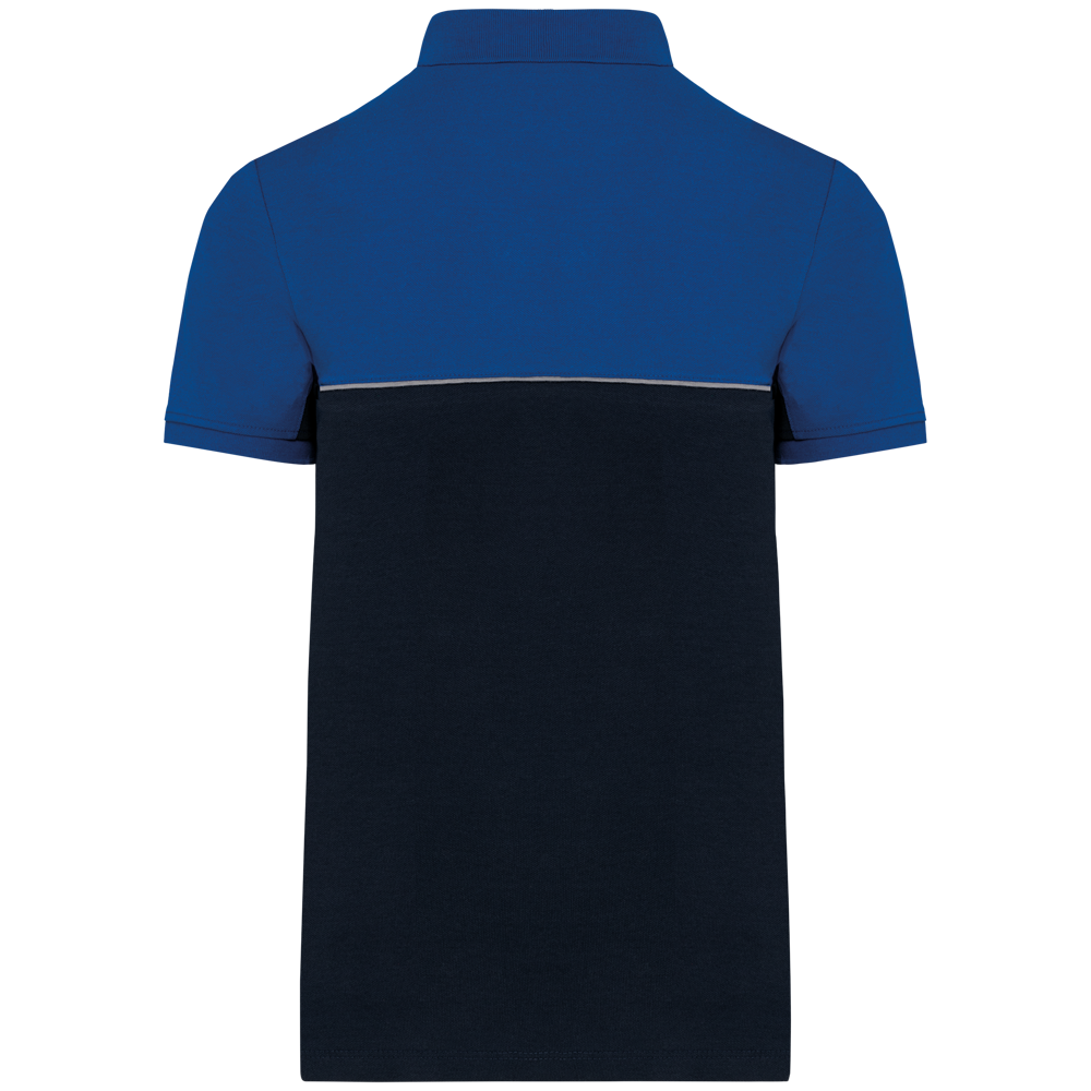 60% katoen / 40% polyester. Gemaakt van 60% gekamd katoen en 40% gerecycleerd polyester. Vortex-garen. Piquétricot. Anti-pluisbehandeling. Wasbaar op 60 °C. Rechte snit. Toon-op-toon lijst met 2 knopen. Kraag in 1x1 ribboord met contrasterende nektape met visgraatmotief.Contrasterende bies tussen de tweekleurige delen van het kledingstuk (lichaam, voorkant mouwen en rug). Afgewerkt met ribboord aan de mouwuiteinden. Zijsplitten met contrasterend visgraatmotief. Afwerking met dubbel stiksel onderaan. Tear-away merklabel.