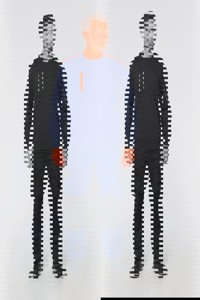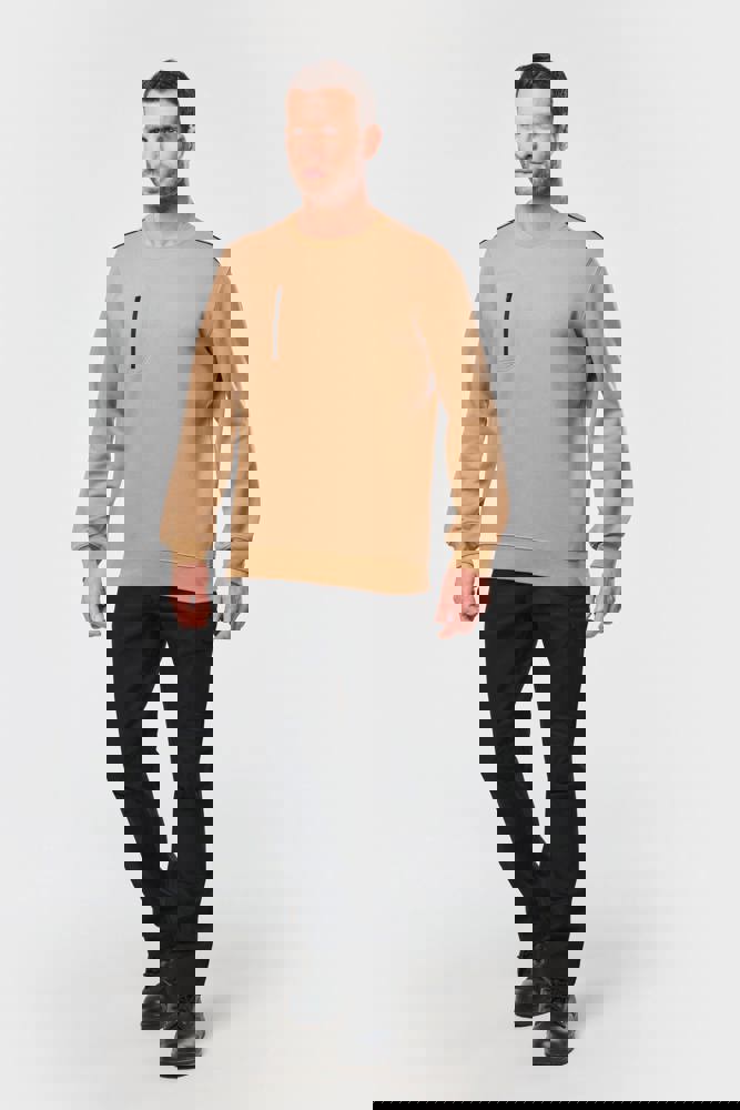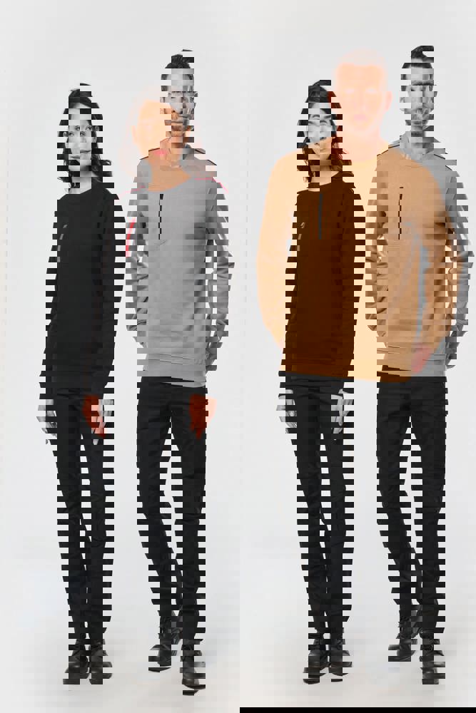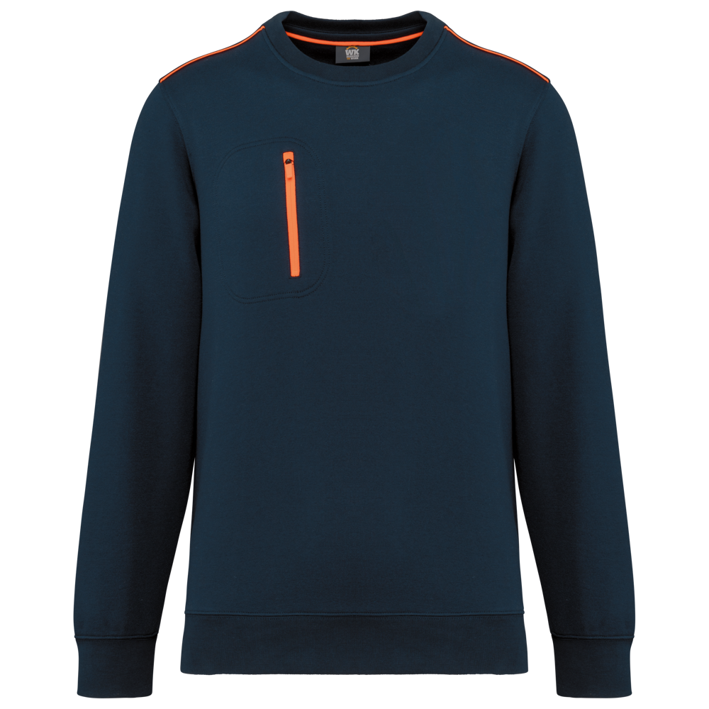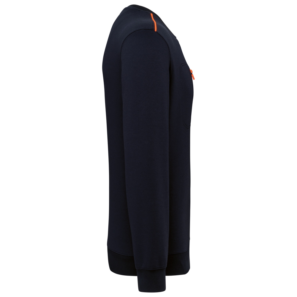 70% polyester / 30% katoen. Gekamd katoen. Aan de binnenkant geborsteld LSF-fleece (Low Shrinkage Fleece) met 3 draden. Vortex-garen. Wasbaar op 60 °C. Rechte snit. Ronde hals met 1x1 ribboord en ton-sur-ton nektape met contrasterende bies. Halvemaanvormige halsopening op de achterkant, voor eenvoudige personalisatie van het merk aan de binnenkant. Contrasterende bies op de schouders. Borstzakje aan de rechterkant, met een contrasterende rits van nylon en een contrasterende ritstrekker. Ton-sur-ton dubbel stiksel op de omtrek van de zak. Tear-away merklabel.