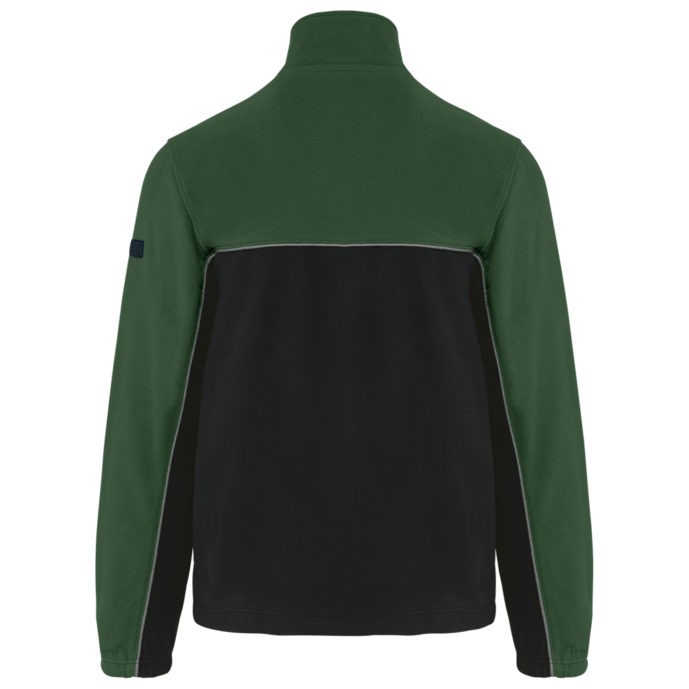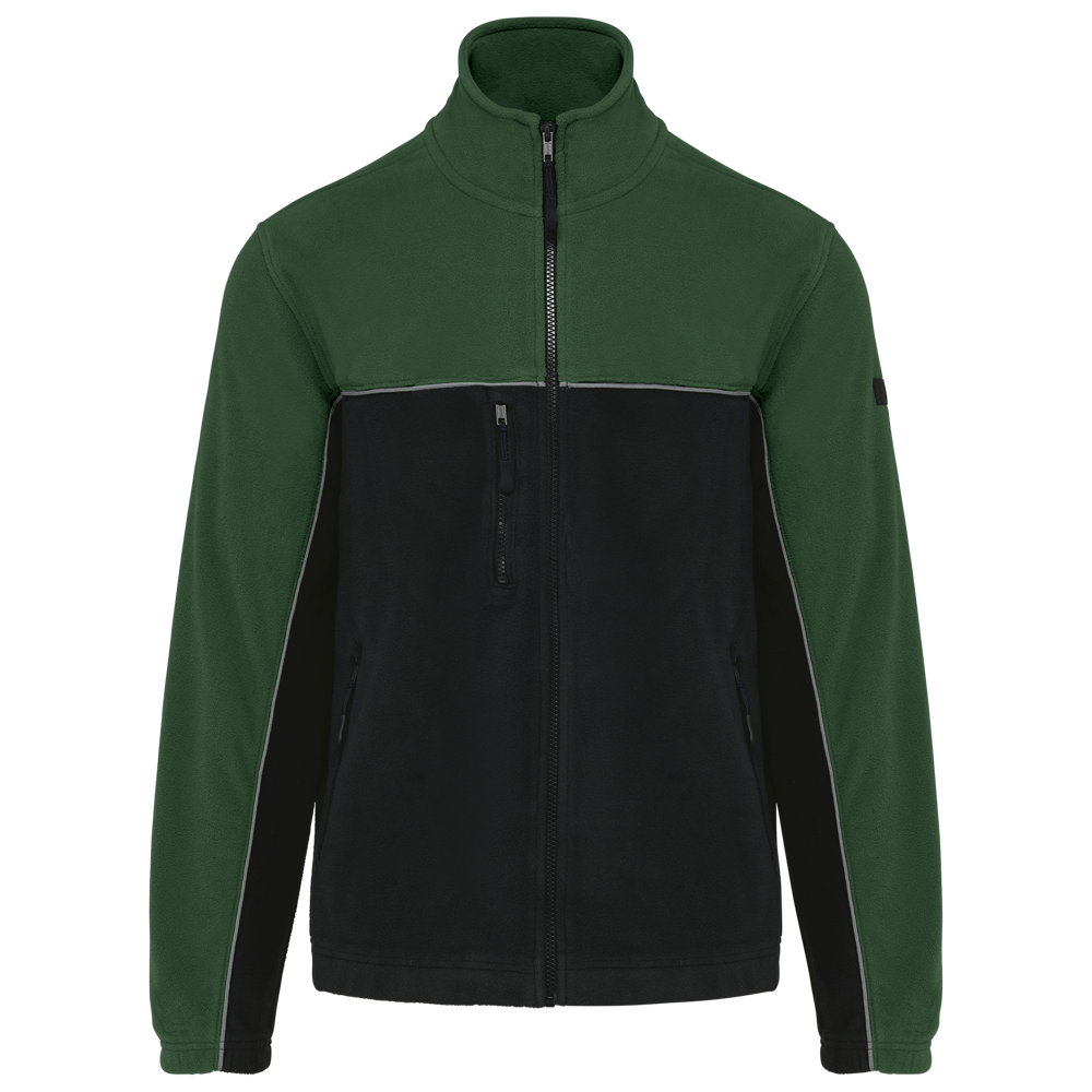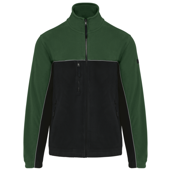 100% polyester. Gemaakt van 100% gerecycleerd polyester. Anti-pluis microfleece. Rechte snit. 2 ritszakken opzij + 1 borstzakje met rits Gerecycleerde toon-op-toon plastic ritsen met ritstrekker. Contrasterende nektape met visgraatmotief. Contrasterende bies tussen de tweekleurige delen van het kledingstuk (lichaam, voorkant mouwen en rug). Elastische penhouder met 3 vakken op de linkermouw. Ophanglint in de kraag. Elastische mouwuiteinden en boord. Tear-away merklabel.