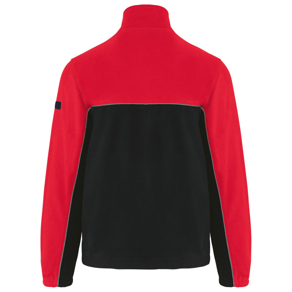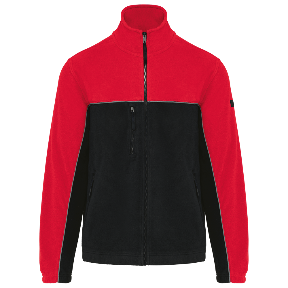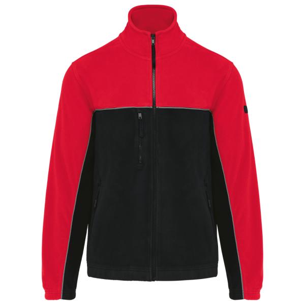 100% polyester. Gemaakt van 100% gerecycleerd polyester. Anti-pluis microfleece. Rechte snit. 2 ritszakken opzij + 1 borstzakje met rits Gerecycleerde toon-op-toon plastic ritsen met ritstrekker. Contrasterende nektape met visgraatmotief. Contrasterende bies tussen de tweekleurige delen van het kledingstuk (lichaam, voorkant mouwen en rug). Elastische penhouder met 3 vakken op de linkermouw. Ophanglint in de kraag. Elastische mouwuiteinden en boord. Tear-away merklabel.
