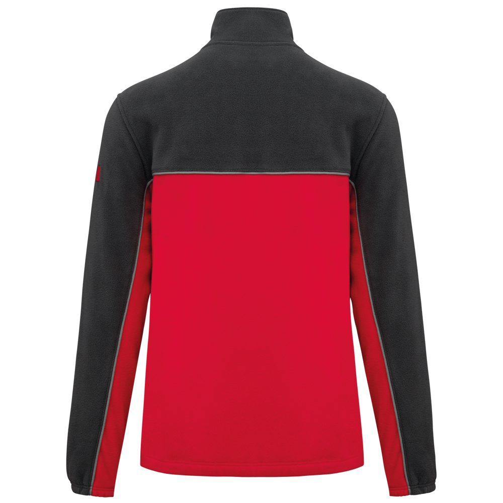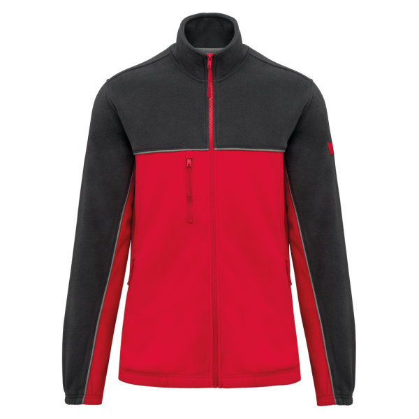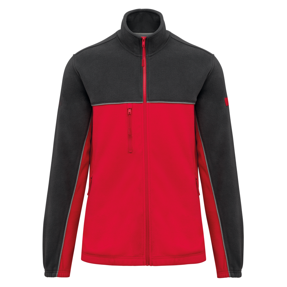 100% polyester. Gemaakt van 100% gerecycleerd polyester. Anti-pluis microfleece. Rechte snit. 2 ritszakken opzij + 1 borstzakje met rits Gerecycleerde toon-op-toon plastic ritsen met ritstrekker. Contrasterende nektape met visgraatmotief. Contrasterende bies tussen de tweekleurige delen van het kledingstuk (lichaam, voorkant mouwen en rug). Elastische penhouder met 3 vakken op de linkermouw. Ophanglint in de kraag. Elastische mouwuiteinden en boord. Tear-away merklabel.