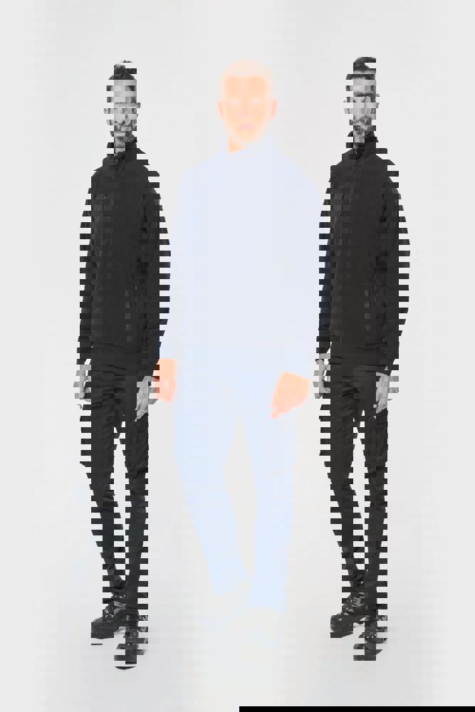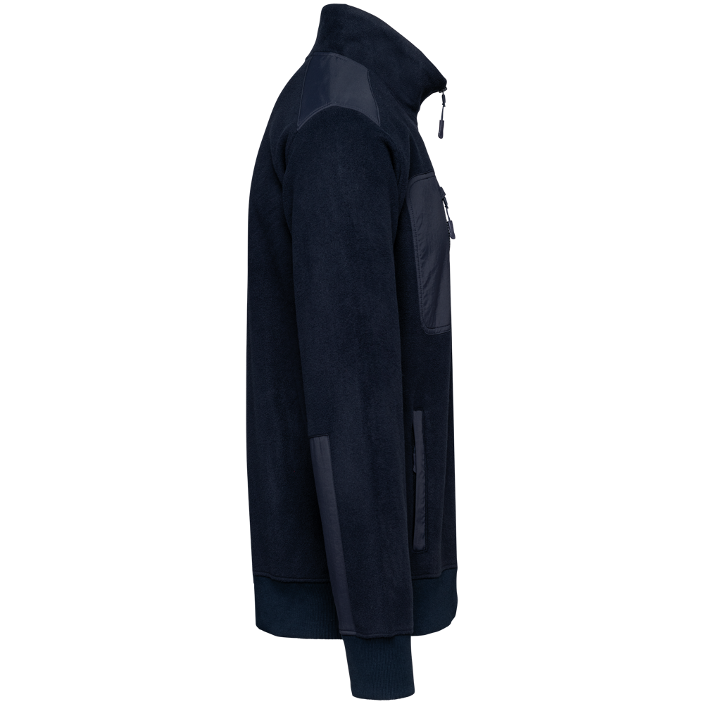 100% gerecycleerd polyester post-consumer. Rechte snit. 2 ritszakken met bies in taslan met ritstrekker aan de voorkant. 1 afgerond borstzakje met rits en ritstrekker in taslan met toon-op-toon stiksel rechts (bij het dragen). Kraag gevoerd met 2x2 ribtricot en rits van gerecycleerd plastic + ophanglus in de kraag. Verstevigende inzetsels aan schouders en voorarm in taslan. 2x2 ribboord in buisconstructie aan de mouwuiteinden en de onderkant. Afneembaar merklabel.