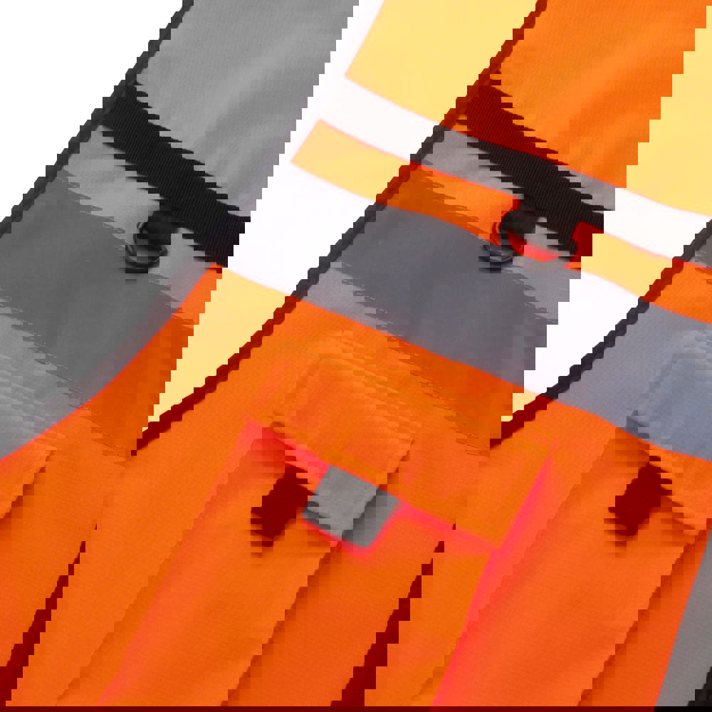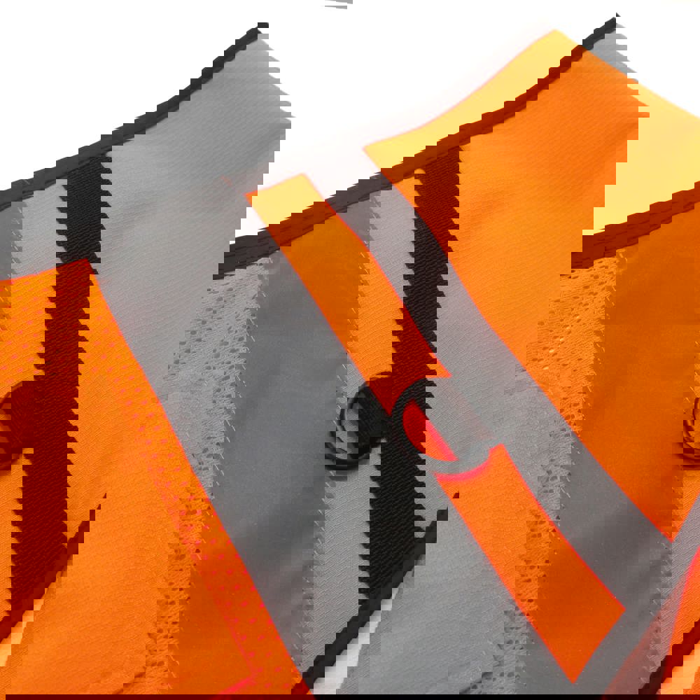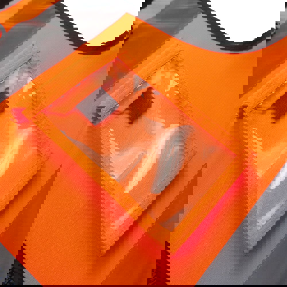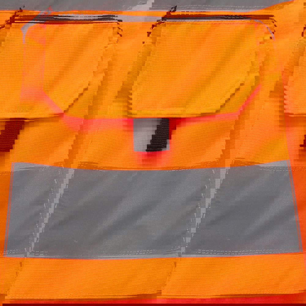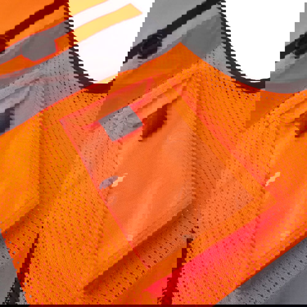100% polyester. Sterk Hi-Vis-hesje met verschillende zakken voor meer gemak op het werk. Twee dubbele zakken van bovenaan toegankelijk met rits-, haak- en gespsluiting. D-ringen. Borstzakken met overslag en ritsen. Venster voor identiteitskaart. Zoom verstelbaar via twee drukknopen. Beter ademend en meer comfort in werkomgevingen en in warme seizoenen dankzij de open mesh aan de onderkant. Voldoet aan de norm EN ISO20471:2013 Klasse 2; Grote decoratiezone in de rug.