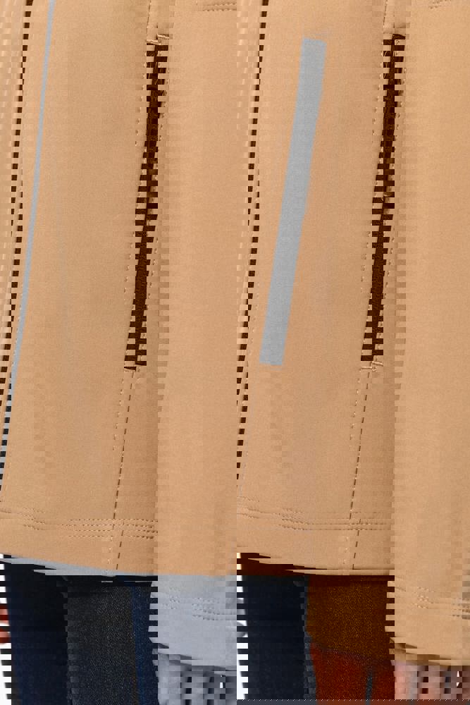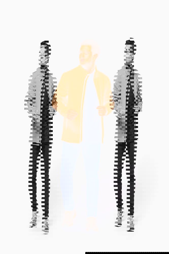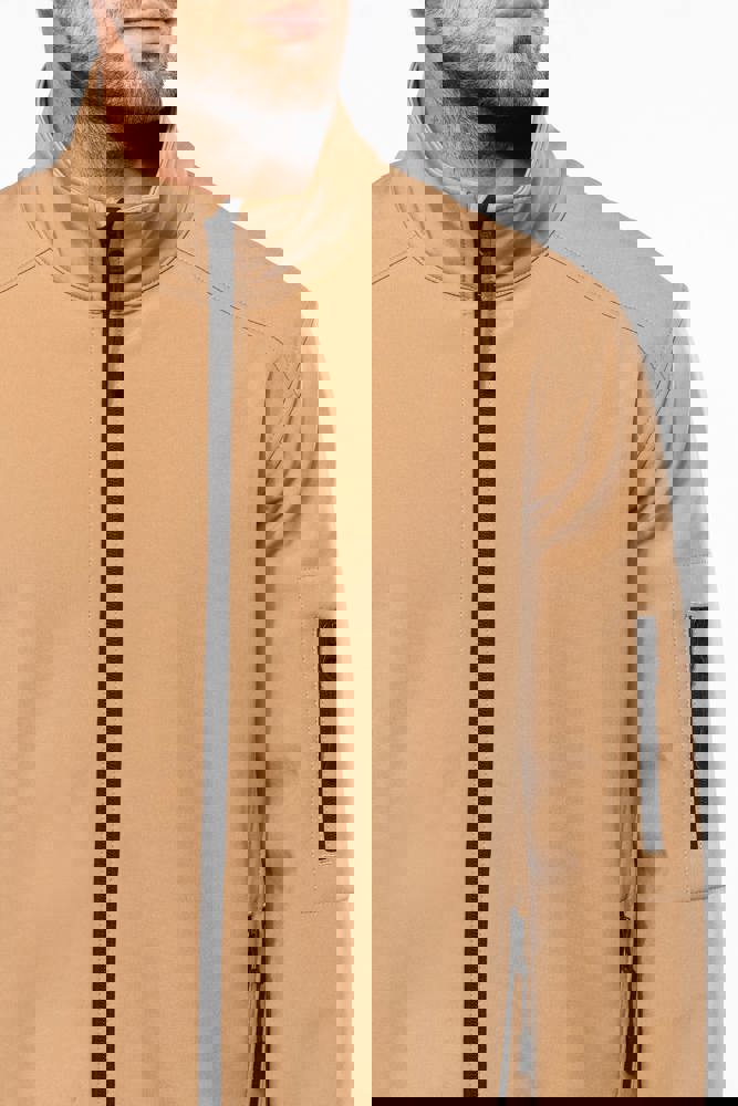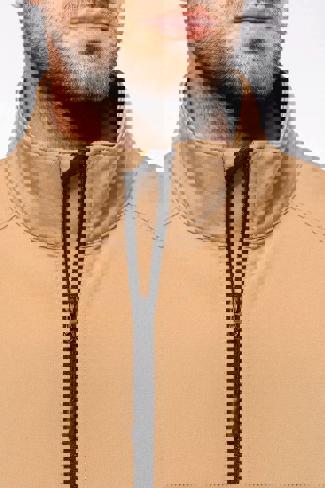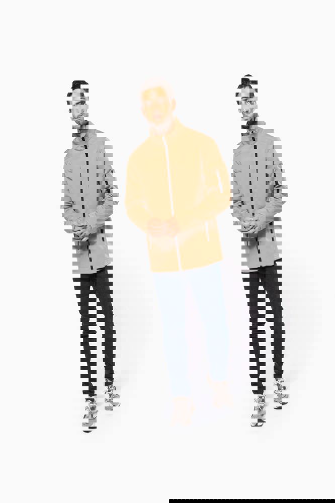Stof in 3 lagen aan elkaar geklit, ademend 3000 g/m2/24H en 8000 mm waterdicht. Buitenkant: 95% polyester / 5% elasthan. Tussenlaag: ademend membraan. Binnenkant: microfleece. Ritssluiting. Zakken met rits aan de voorkant. 1 zak met rits op de linkermouw.