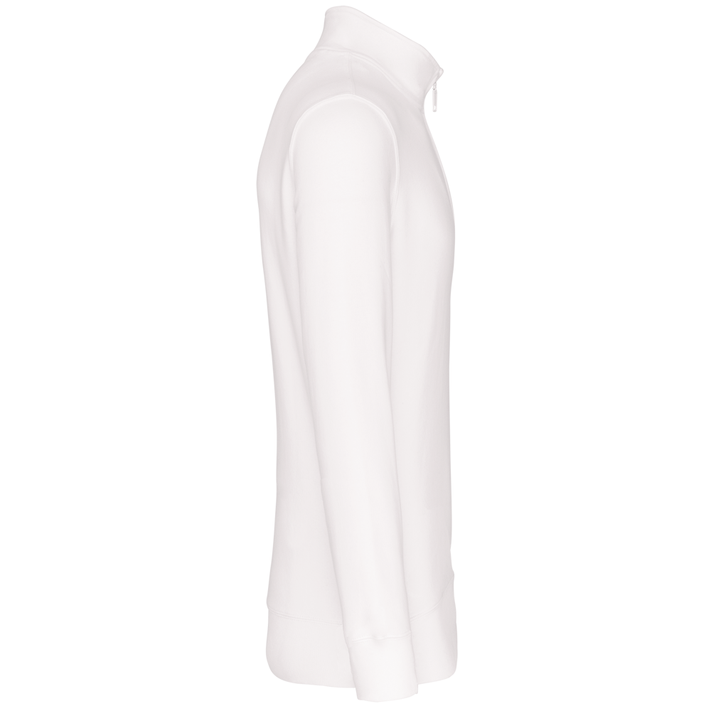 80% katoen / 20% polyester (Ash Heather : 79% katoen / 20% polyester / 1% viscose). Buitenoppervlak 100% katoen. LSF-behandeling (Low Shrinkage Fleece : voorgekrompen fleece). Aan de binnenkant geborsteld fleece 3 draden van gekamd katoen. Ingezette mouwen. Kraag met toon-op-toon plastic ritssluiting. Nektape in contrasterende kleur aan de halsopening (Navy voor de kleur Oxford Grey en Ash Heather ; Oxford Grey voor alle andere kleuren). Ribboord aan mouwuiteinden en aan de onderkant.
