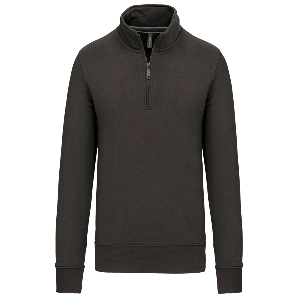 80% katoen / 20% polyester (Ash Heather : 79% katoen / 20% polyester / 1% viscose). Buitenoppervlak 100% katoen. LSF-behandeling (Low Shrinkage Fleece : voorgekrompen fleece). Aan de binnenkant geborsteld fleece 3 draden van gekamd katoen. Ingezette mouwen. Kraag met toon-op-toon plastic ritssluiting. Nektape in contrasterende kleur aan de halsopening (Navy voor de kleur Oxford Grey en Ash Heather ; Oxford Grey voor alle andere kleuren). Ribboord aan mouwuiteinden en aan de onderkant.
