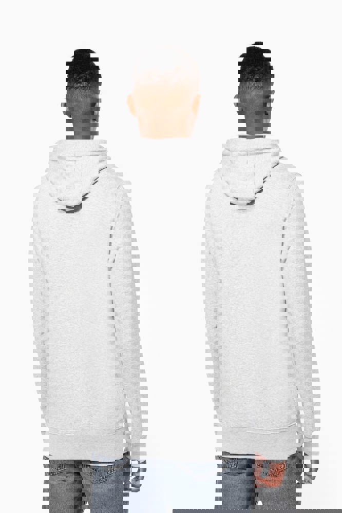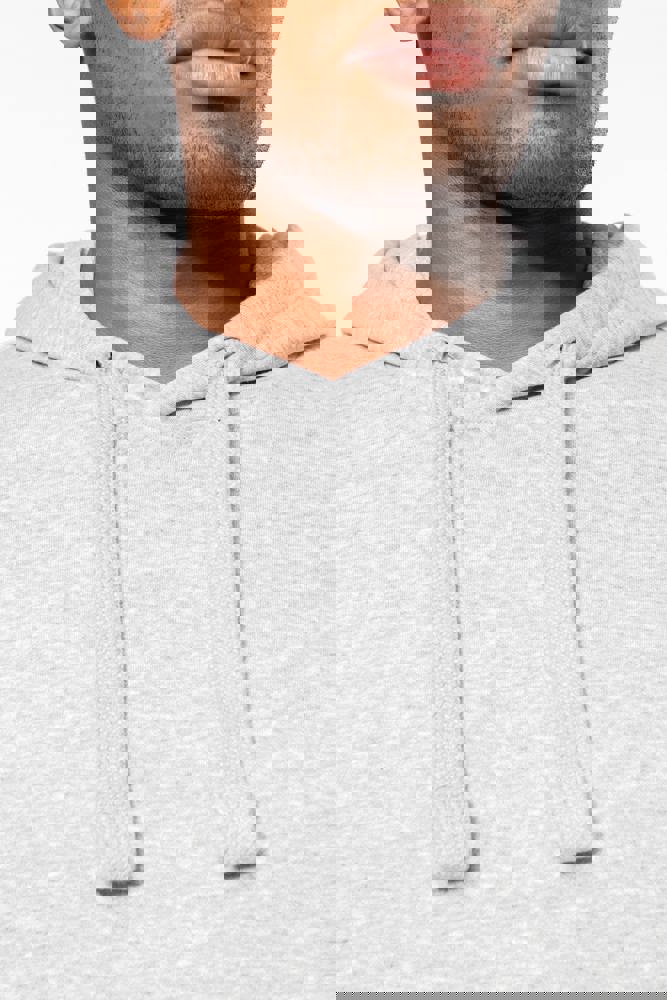 80% katoen / 20% polyester (Ash Heather: 79% katoen / 20% polyester / 1% viscose). Buitenoppervlak 100% katoen. LSF-behandeling (Low Shrinkage Fleece: voorgekrompen fleece). Aan de binnenkant geborsteld fleece 3 draden van gekamd katoen. Ingezette mouwen. Nektape in contrasterende kleur aan de halsopening (Navy voor de kleur Oxford Grey en Ash Heather ; Oxford Grey voor alle andere kleuren). Gevoerde capuchon in honinggraatstructuur met aanrijgkoordjes. Kangoeroezakken. Ribboord aan mouwuiteinden en aan de onderkant.
