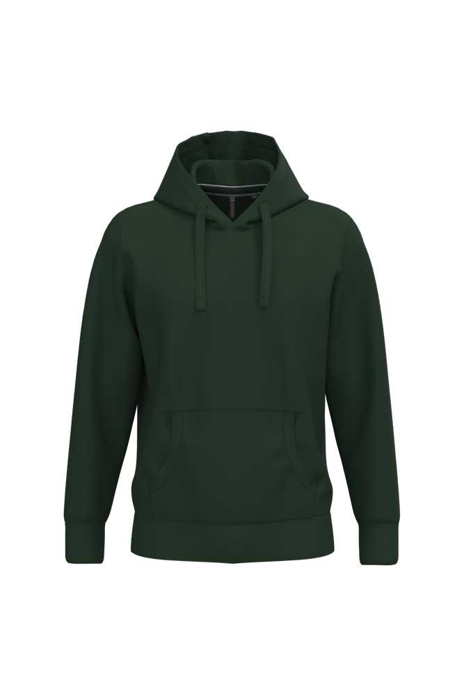 80% katoen / 20% polyester (Ash Heather: 79% katoen / 20% polyester / 1% viscose). Buitenoppervlak 100% katoen. LSF-behandeling (Low Shrinkage Fleece: voorgekrompen fleece). Aan de binnenkant geborsteld fleece 3 draden van gekamd katoen. Ingezette mouwen. Nektape in contrasterende kleur aan de halsopening (Navy voor de kleur Oxford Grey en Ash Heather ; Oxford Grey voor alle andere kleuren). Gevoerde capuchon in honinggraatstructuur met aanrijgkoordjes. Kangoeroezakken. Ribboord aan mouwuiteinden en aan de onderkant.