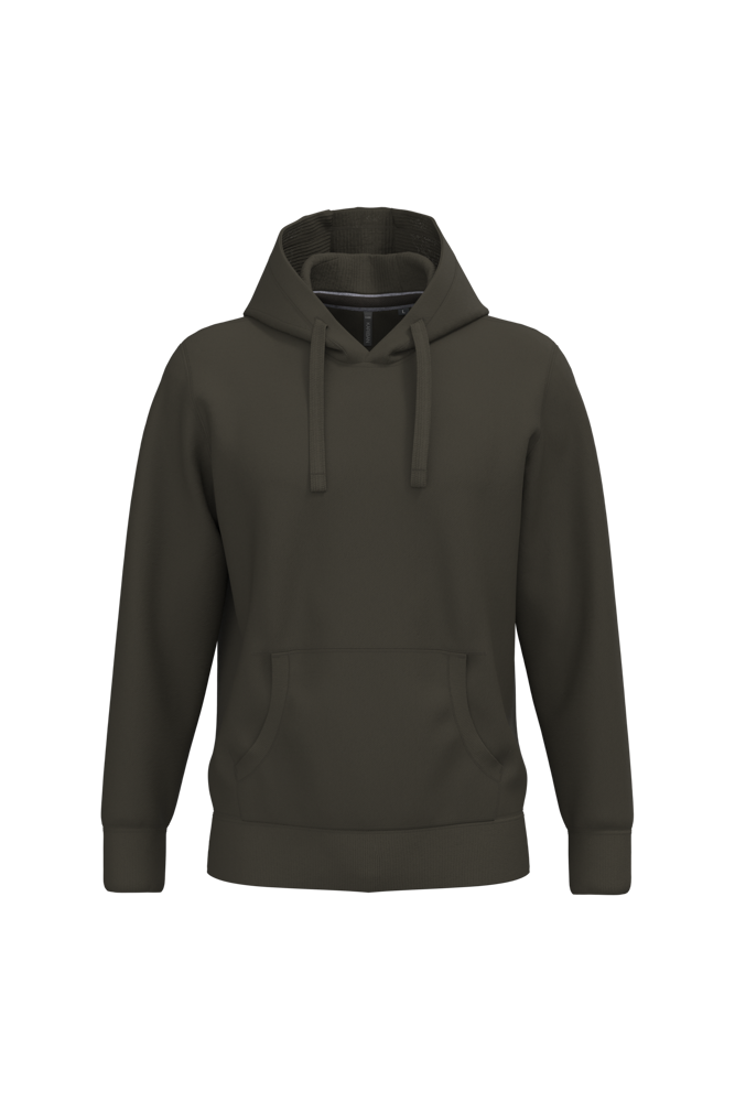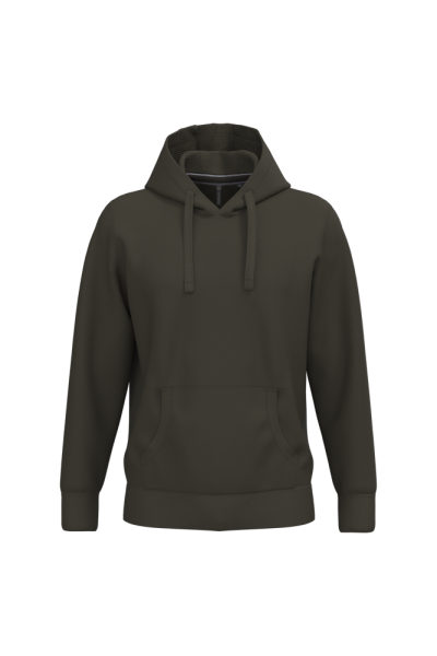 80% katoen / 20% polyester (Ash Heather: 79% katoen / 20% polyester / 1% viscose). Buitenoppervlak 100% katoen. LSF-behandeling (Low Shrinkage Fleece: voorgekrompen fleece). Aan de binnenkant geborsteld fleece 3 draden van gekamd katoen. Ingezette mouwen. Nektape in contrasterende kleur aan de halsopening (Navy voor de kleur Oxford Grey en Ash Heather ; Oxford Grey voor alle andere kleuren). Gevoerde capuchon in honinggraatstructuur met aanrijgkoordjes. Kangoeroezakken. Ribboord aan mouwuiteinden en aan de onderkant.