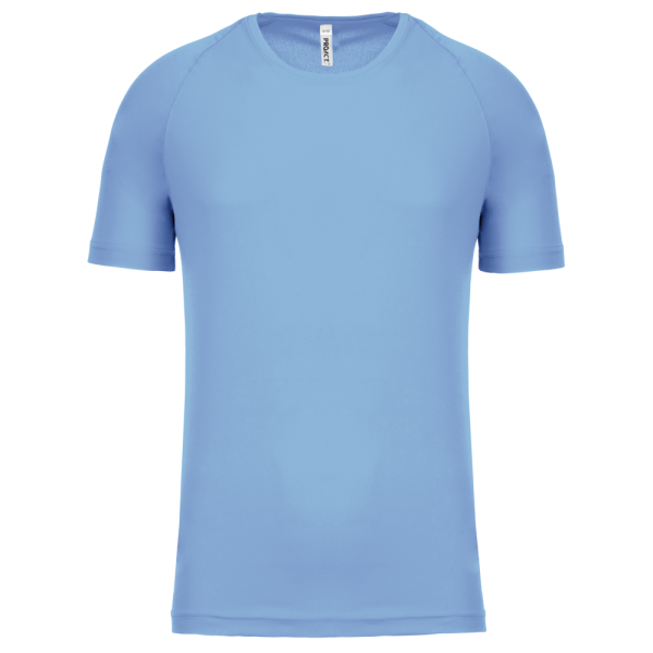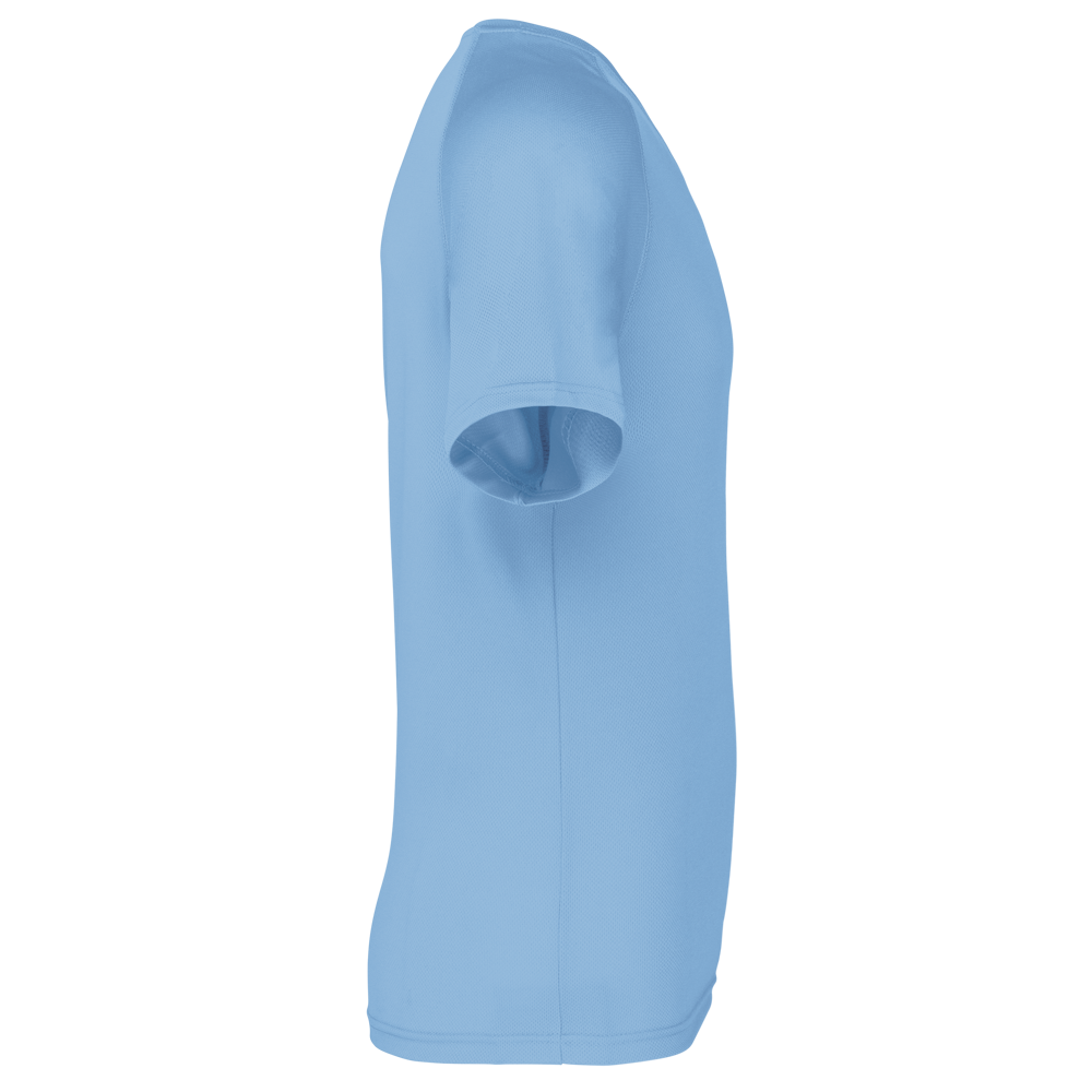 100% polyester. Sneldrogende lichte stof. Ronde hals. Nektape. Raglan mouwen met overstiksels. Afwerking met dubbele stiksels aan de mouwuiteinden en onderkant.
