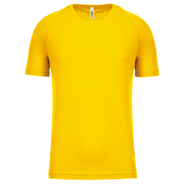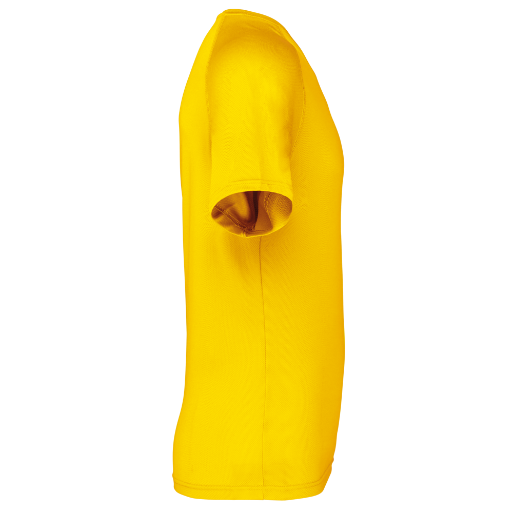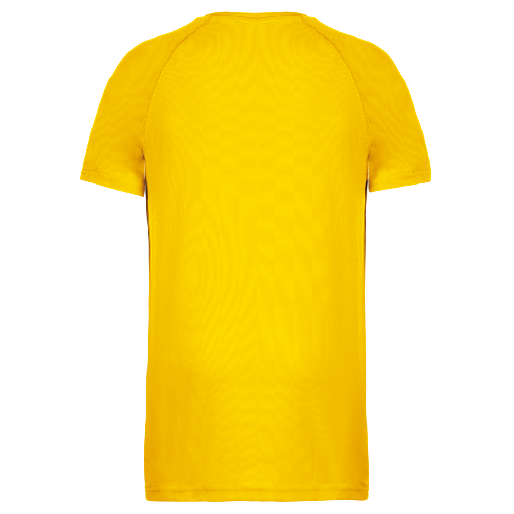 100% polyester. Sneldrogende lichte stof. Ronde hals. Nektape. Raglan mouwen met overstiksels. Afwerking met dubbele stiksels aan de mouwuiteinden en onderkant.