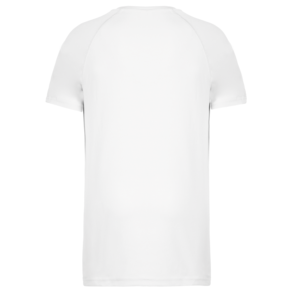 100% polyester. Sneldrogende lichte stof. Ronde hals. Nektape. Raglan mouwen met overstiksels. Afwerking met dubbele stiksels aan de mouwuiteinden en onderkant.