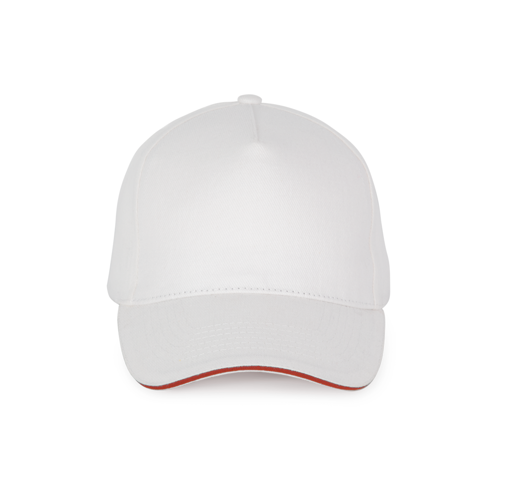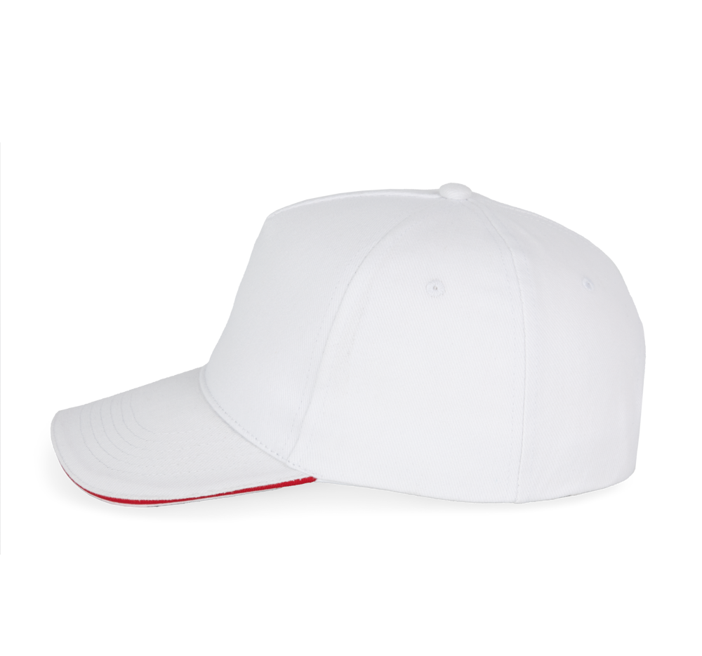100% katoen. Pet met 5 panelen. Verstelbare sluiting met metalen gesp en zelfblokkerende lus.