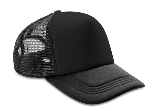 Gewatteerd met 100% polyester. 5 panelen: 4 van mesh en 1 van stof. Wit voorpaneel. Regelbaar met plastic Snapback-retrotong. Half gebogen zonneklep van stof. Wasbaar met de hand.