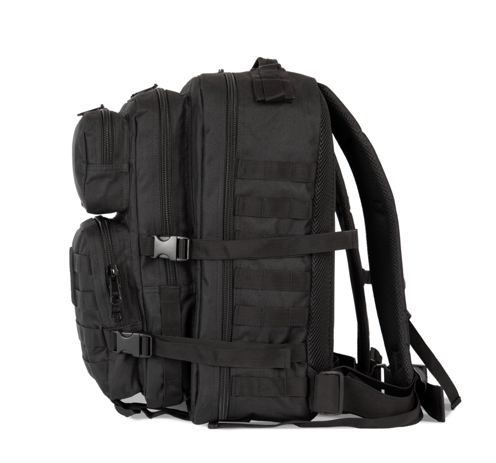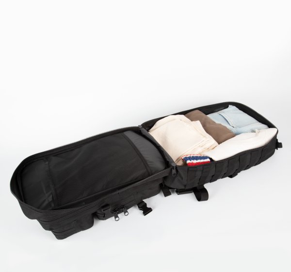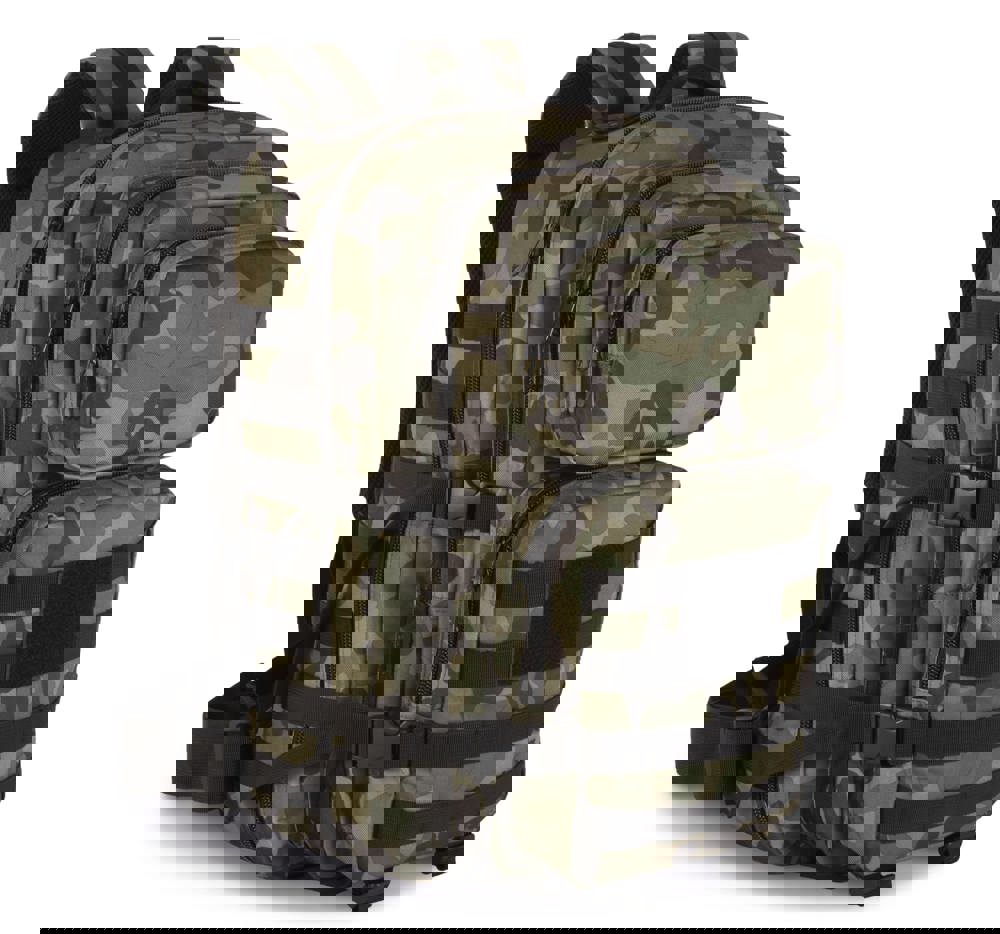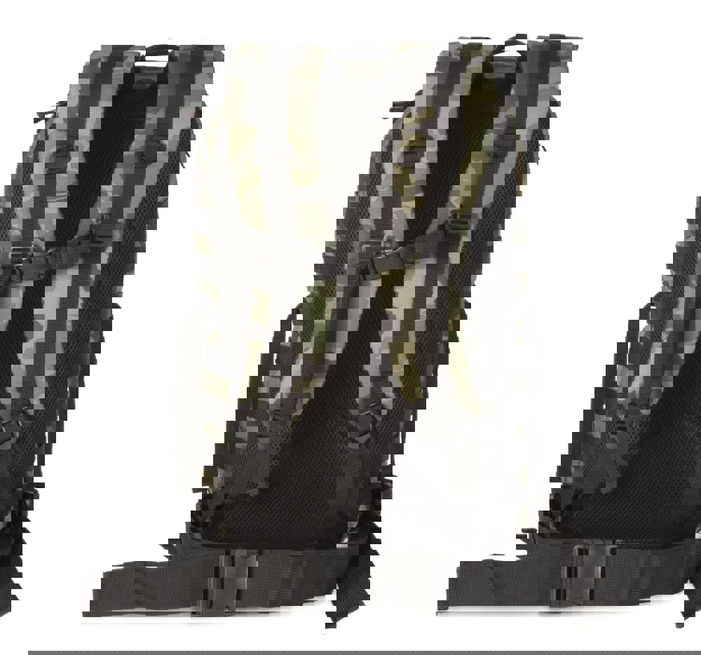 100 % polyester. M.O.L.L.E. rugzak in 600D polyester met polyvinyl coating voor extra stevigheid en duurzaamheid. Ideaal voor outdoor activiteiten, de rugzak heeft zakken voor waterzakken, gaatjes voor de waterslangetjes, een groot compartiment vooraan, klittenband, M.O.L.L.E. webbing, compressie banden, ergonomisch design en verstelbare gewatteerde schouderbanden.camouflage print.