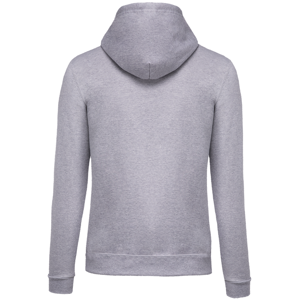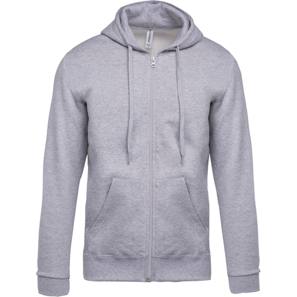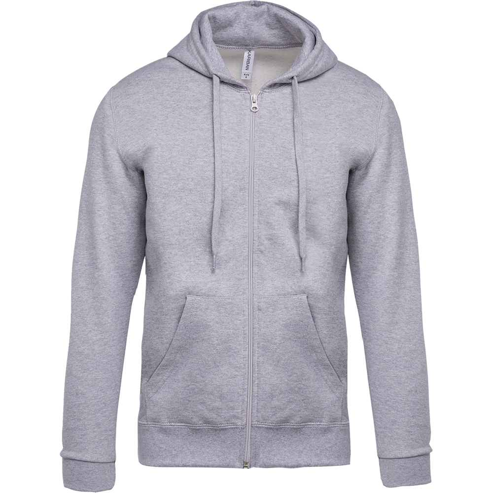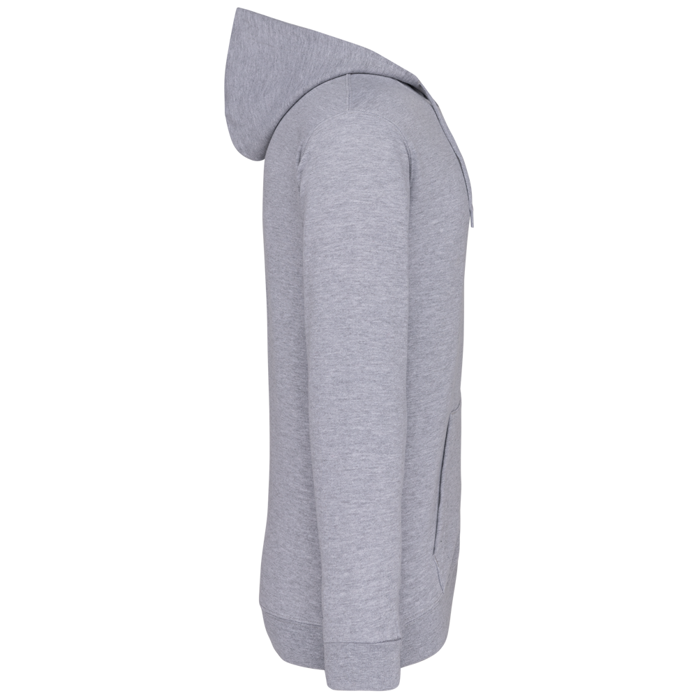 80% katoen / 20% polyester. Gekamd katoen. Geborsteld fleece aan de binnenkant. Ingezette mouwen. Nylon ritssluiting. Gevoerde capuchon met toon op toon aanrijgkoordjes. Kangoeroezakken. Ribboord aan mouwuiteinden en aan de onderkant.