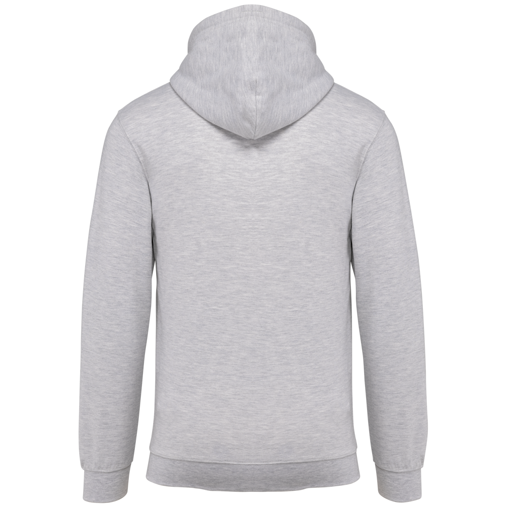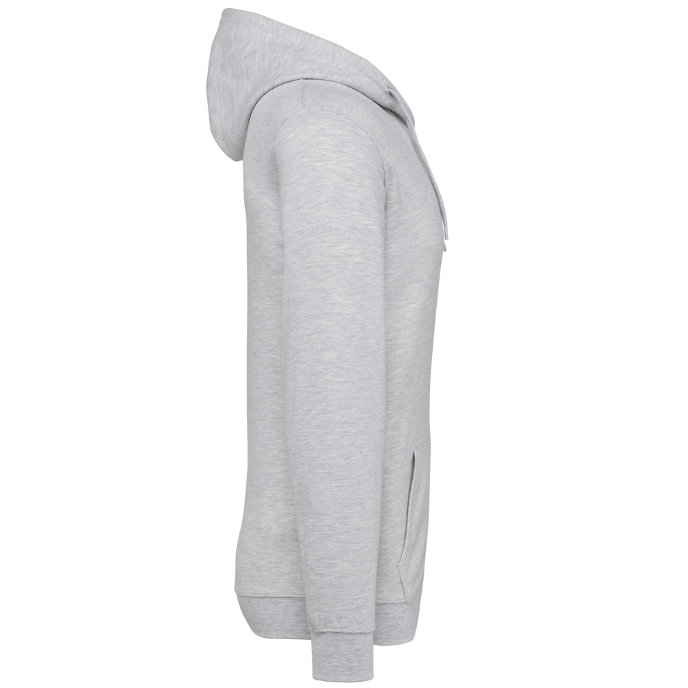 80% katoen / 20% polyester. Gekamd katoen. Geborsteld fleece aan de binnenkant. Ingezette mouwen. Nylon ritssluiting. Gevoerde capuchon met toon op toon aanrijgkoordjes. Kangoeroezakken. Ribboord aan mouwuiteinden en aan de onderkant.