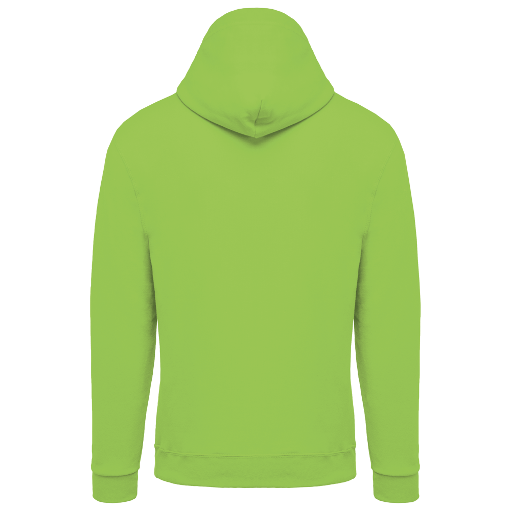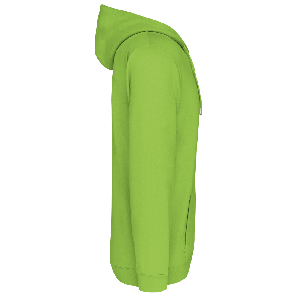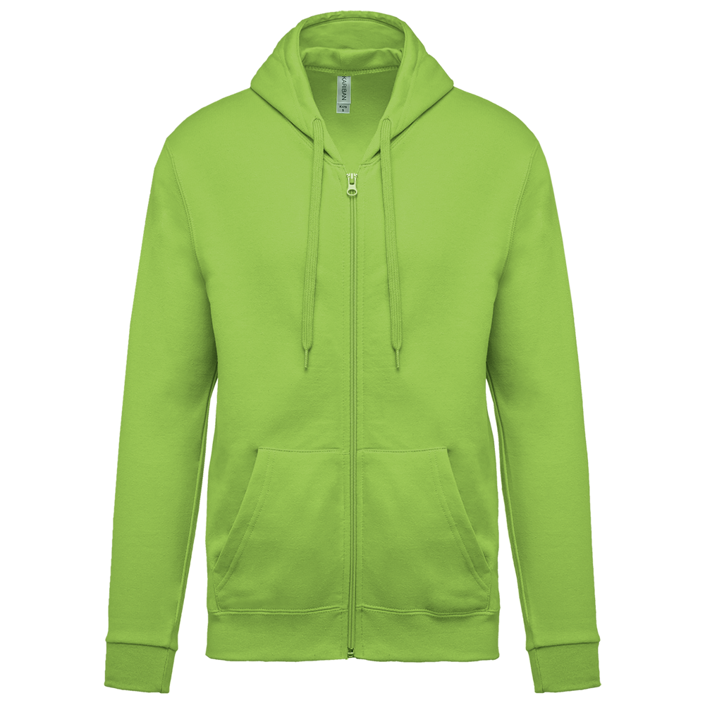 80% katoen / 20% polyester. Gekamd katoen. Geborsteld fleece aan de binnenkant. Ingezette mouwen. Nylon ritssluiting. Gevoerde capuchon met toon op toon aanrijgkoordjes. Kangoeroezakken. Ribboord aan mouwuiteinden en aan de onderkant.