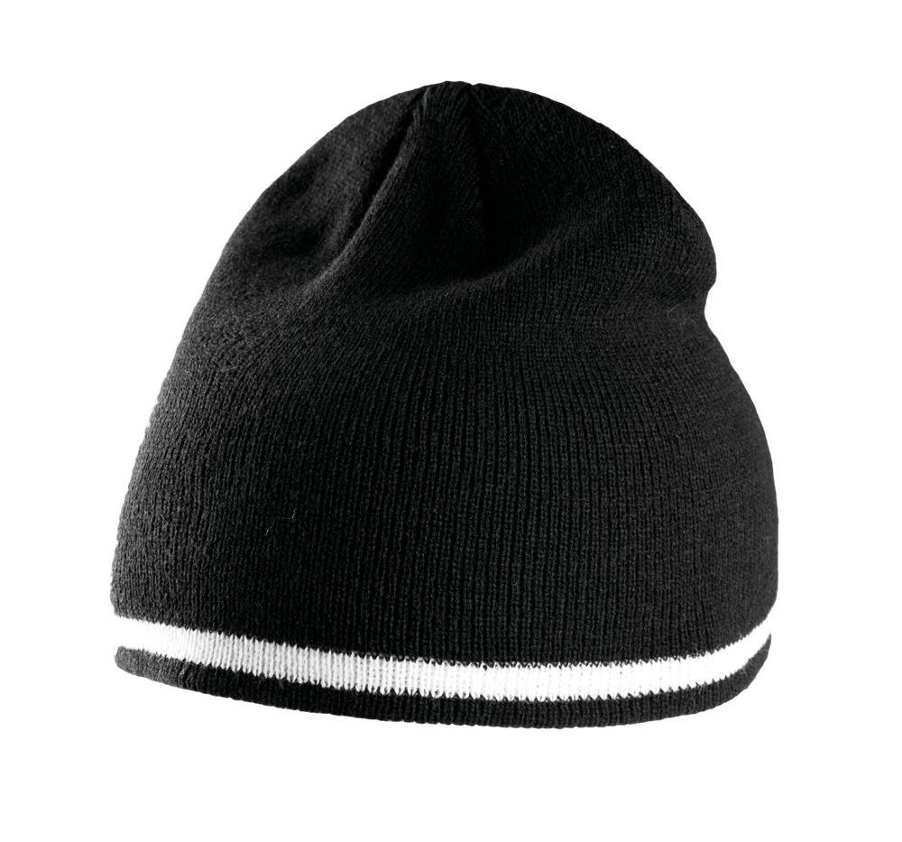100% acryl. Gebreide muts met tweekleurig gecontrasteerd boord aan de rand.