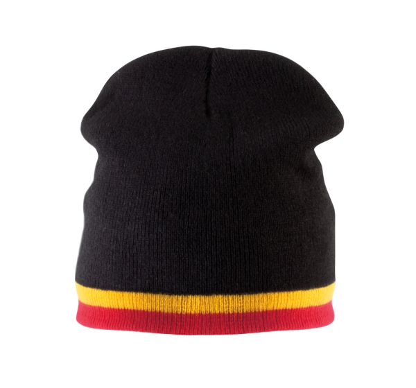 100% acryl. Gebreide muts met tweekleurig gecontrasteerd boord aan de rand.