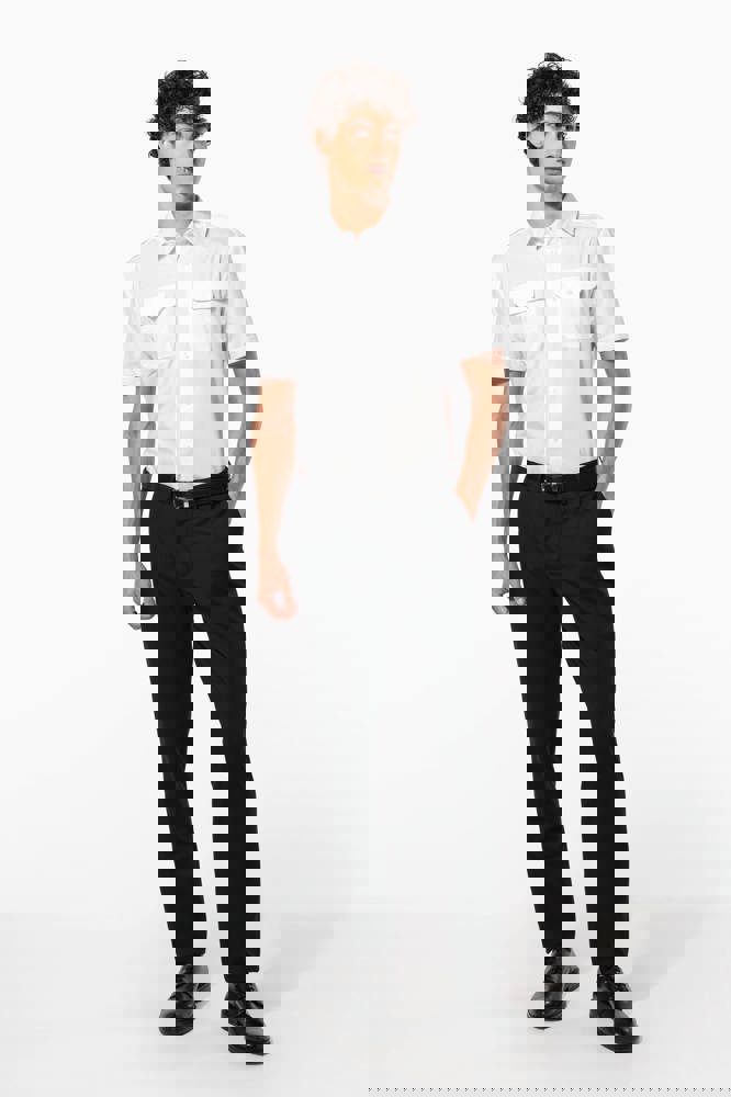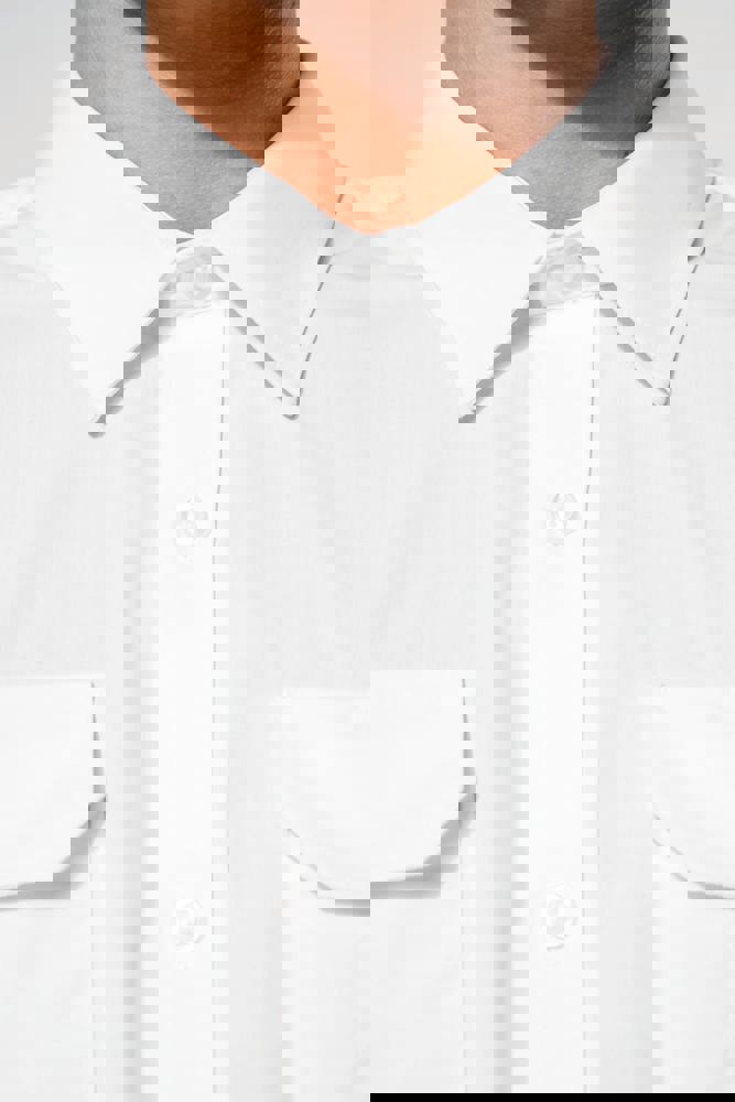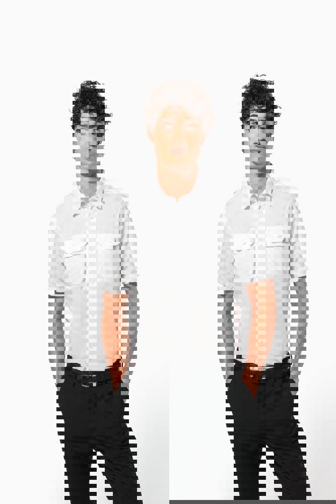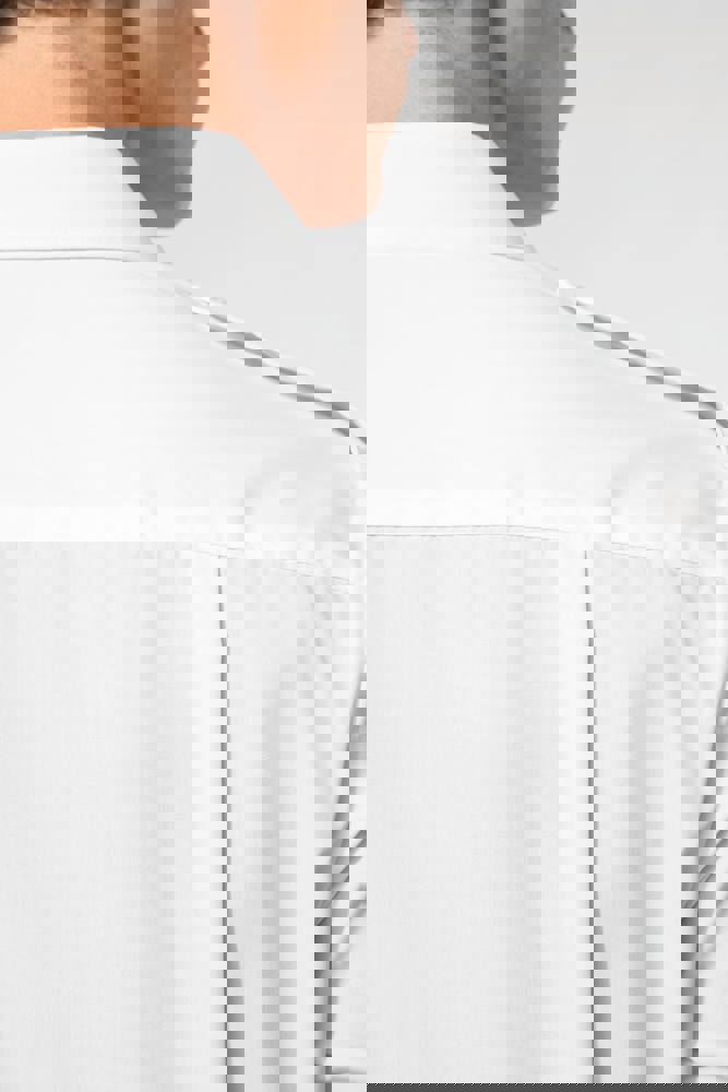 65% polyester / 35% popelinekatoen. Gemakkelijk in onderhoud (EasyCare-behandeling). Toon op toon knopen. 2 borstzakken met klep, waarvan aan de linkerkant een met plaats voor een pen. Ruimteplooi op de achterkant. Knooplijst op de schouders om galons te bevestigen (epauletten niet meegeleverd). Afgewerkt met omslag aan de mouwuiteinden.