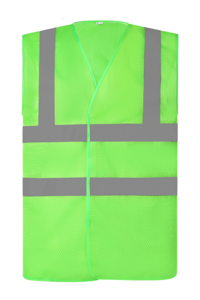 100% polyester. 100% gerecycled polyester. Gemaakt van petflessen. Gemaakt van ademende, licht gebreide gaas. 5 cm brede reflectieband rond het lichaam en over elke schouder. Velcro® sluiting vooraan. Conform aan de Amerikaanse Nationale Norm ANSI/ISEA 107-2004 en Europese EN ISO20471:2013 Klasse 2 : enkel Hi-Vis Orange en H-Vis Yellow.