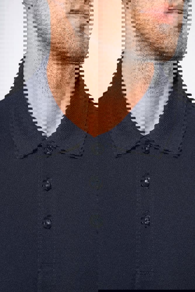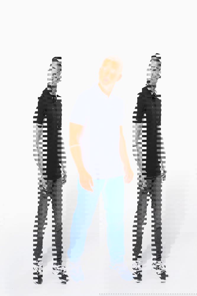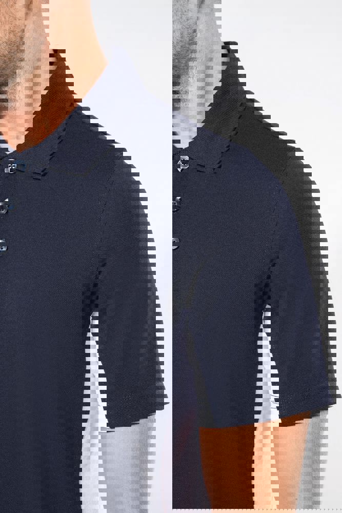 65% polyester / 35% katoen. (Black/Dark Grey ; Forest Green/Black ; Royal Blue/Navy : 65%gerecycled polyester / 35% katoen) .Piqué. Kraag in rib. Knooplijst met 3 toon op toon knopen. Zijkanten en onder de mouwen in constrastkleur. Geen ribboord aan de mouwuiteinden.