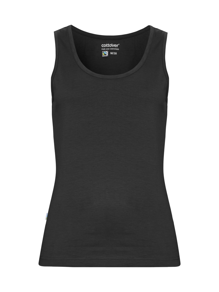 Classic tanktop met brede schouderbanden in een netjes licht getailleerd model. Bies langs de halslijn en armsgaten. Gedrukt label op de achterkant van de nek.